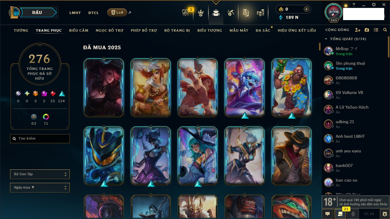 Rank Đơn: Chưa RankKhung: BạcTướng: 171 - Còn 60553 THXTrang Phục: 273Rank ĐTCL: Chưa RankLinh Thú: 146