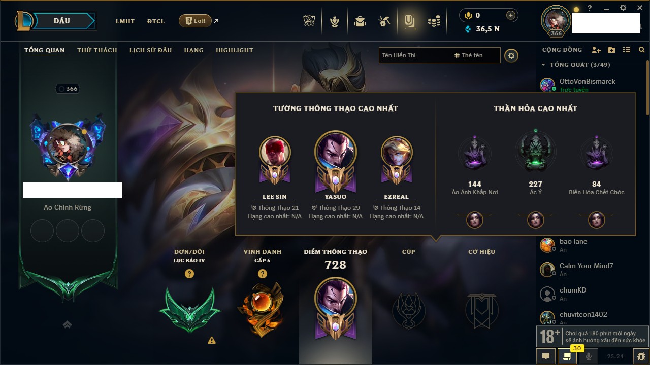 Rank Đơn: Chưa RankKhung: Bạch kimTướng: 172 - Còn 81 THXTrang Phục: 226Rank ĐTCL: Chưa RankLinh Thú: 193