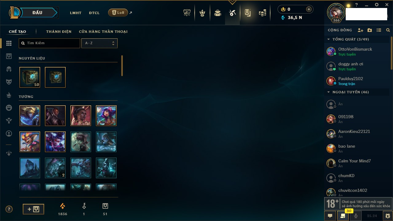 Rank Đơn: Chưa RankKhung: Bạch kimTướng: 170 - Còn 146400 THXTrang Phục: 225Rank ĐTCL: Chưa RankLinh Thú: 134