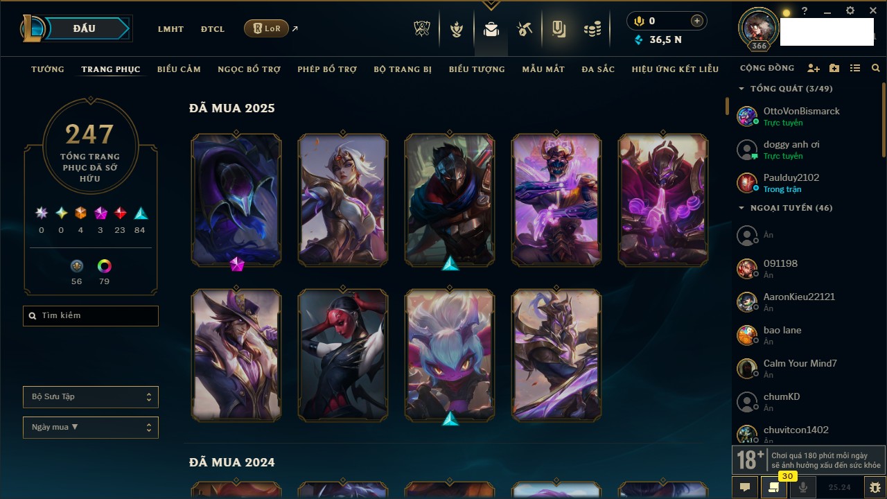 Rank Đơn: Chưa RankKhung: Chưa có khungTướng: 157 - Còn 2008 THXTrang Phục: 206Rank ĐTCL: Chưa RankLinh Thú: 29