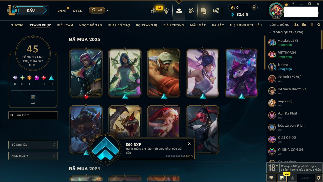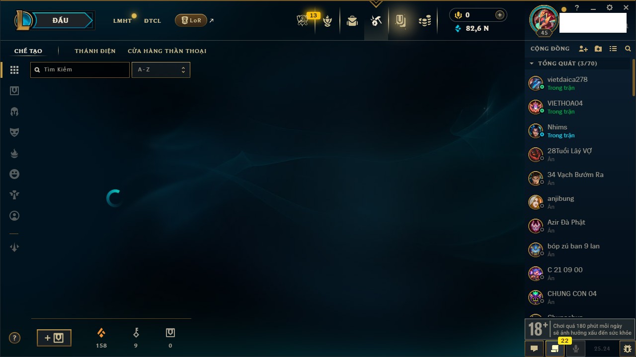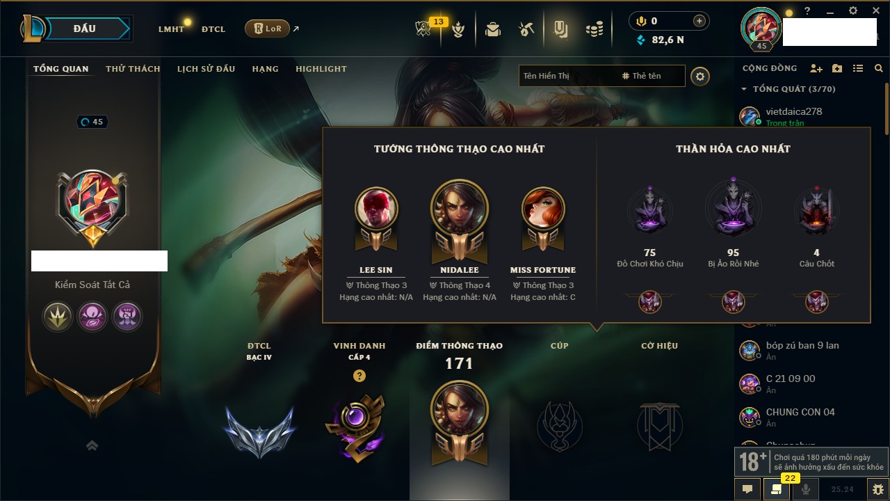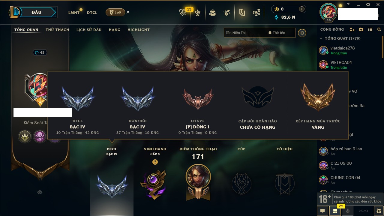 Rank Đơn: Chưa Rank Khung: Đồng Tướng: 171 - Còn 82665 THX Trang Phục: 45 Rank ĐTCL: Chưa Rank Linh Thú: 95