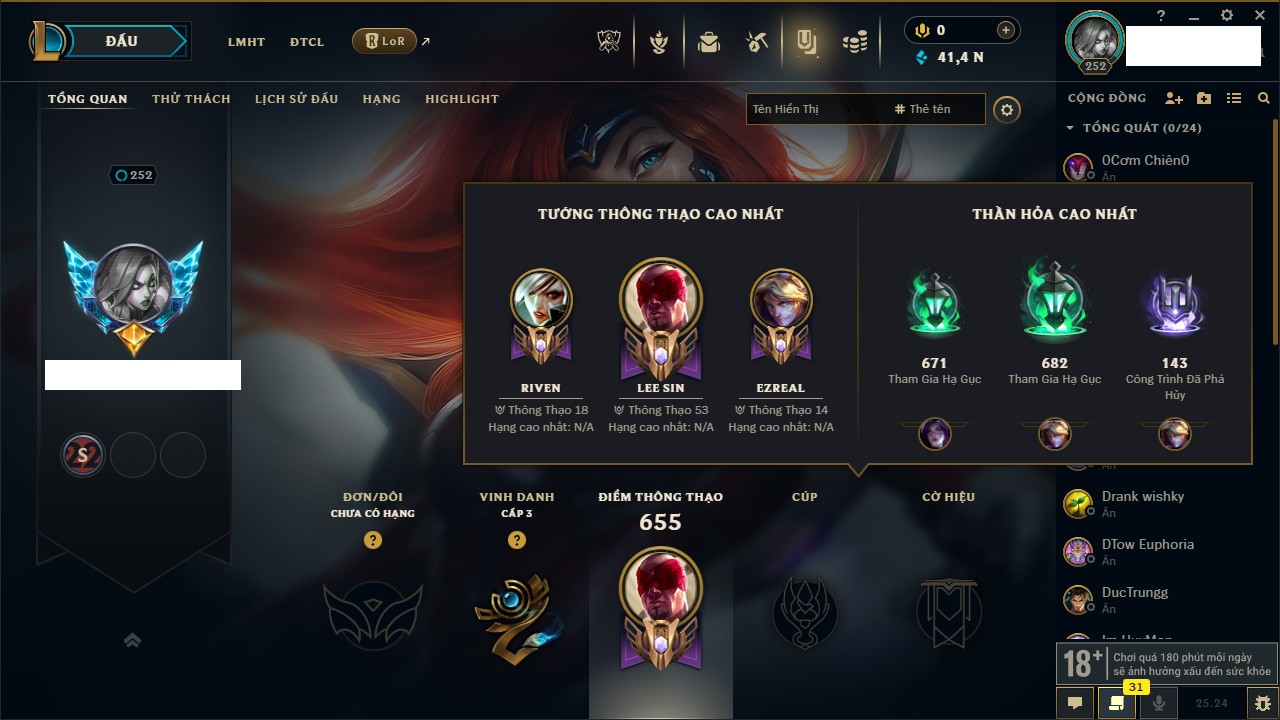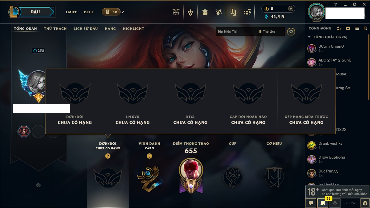 Rank Đơn: Chưa Rank Khung: Chưa có khung Tướng: 157 - Còn 51905 THX Trang Phục: 3 Rank ĐTCL: Chưa Rank Linh Thú: 175