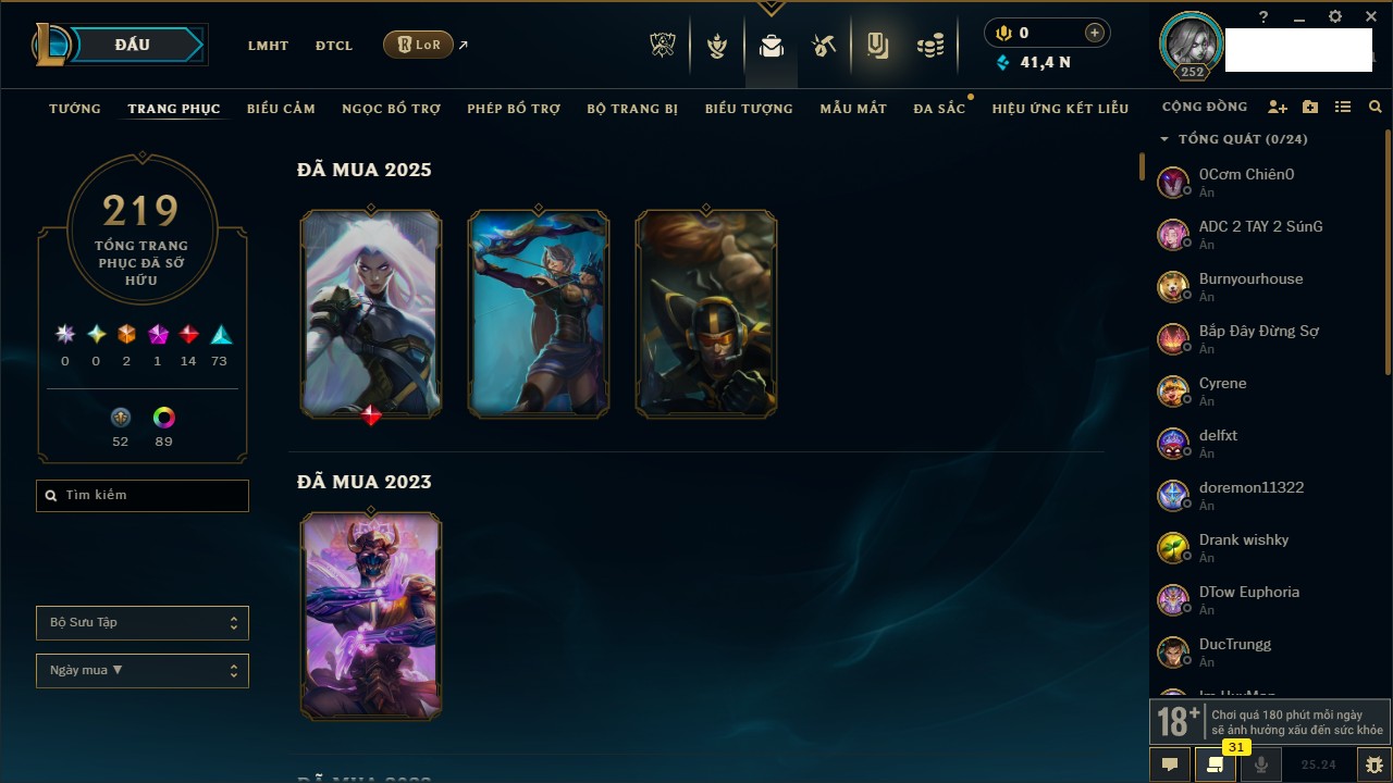 Rank Đơn: Chưa Rank Khung: Chưa có khung Tướng: 171 - Còn 52162 THX Trang Phục: 78 Rank ĐTCL: Chưa Rank Linh Thú: 145