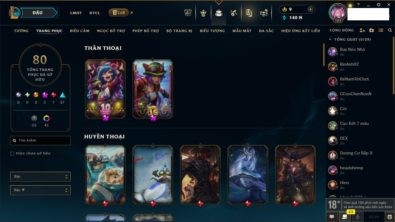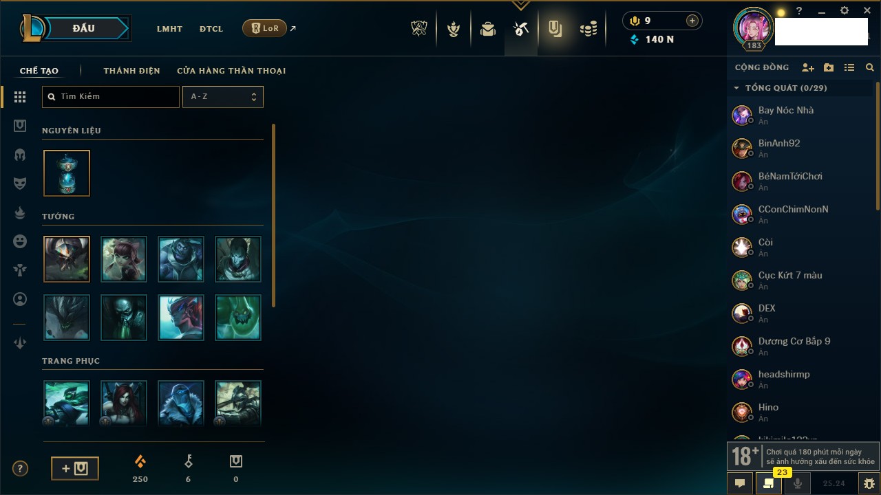 Rank Đơn: Chưa Rank Khung: Vàng Tướng: 171 - Còn 140250 THX Trang Phục: 80 Rank ĐTCL: Chưa Rank Linh Thú: 68