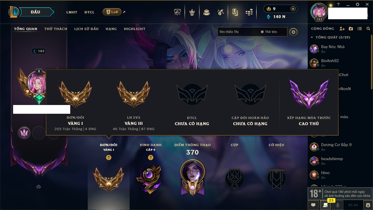 Rank Đơn: Bạc I Khung: Chưa có khung Tướng: 153 - Còn 4550 THX Trang Phục: 192 Rank ĐTCL: Chưa Rank Linh Thú: 35