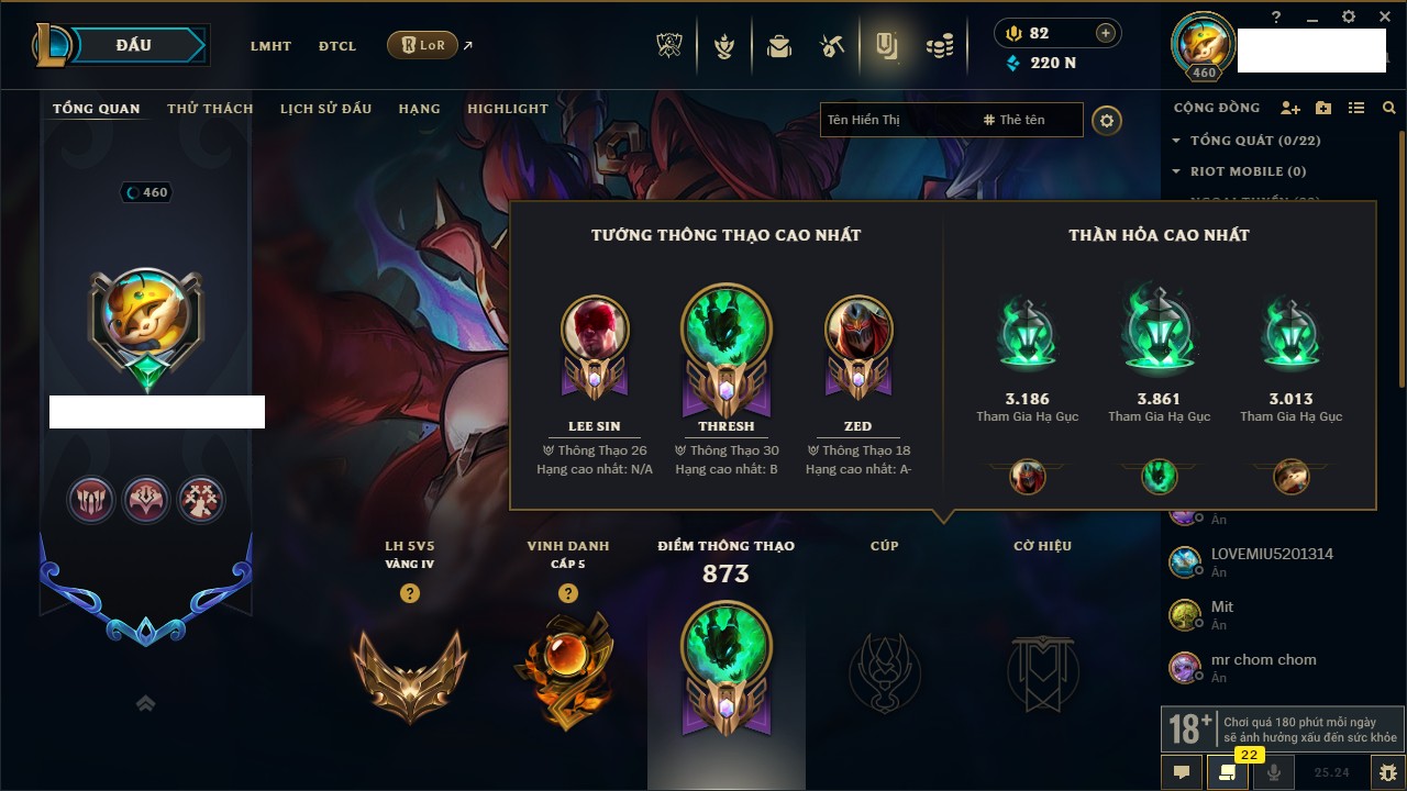 Rank Đơn: Chưa Rank Khung: Vàng Tướng: 126 - Còn 23055 THX Trang Phục: 114 Rank ĐTCL: Chưa Rank Linh Thú: 21