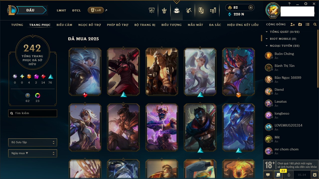 Rank Đơn: Chưa Rank Khung: Chưa có khung Tướng: 172 - Còn 65375 THX Trang Phục: 218 Rank ĐTCL: Chưa Rank Linh Thú: 74