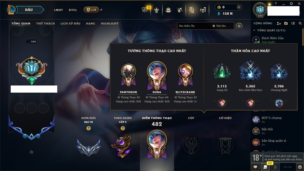 Rank Đơn: Chưa RankKhung: Bạch kimTướng: 172 - Còn 179290 THXTrang Phục: 187Rank ĐTCL: Chưa RankLinh Thú: 49