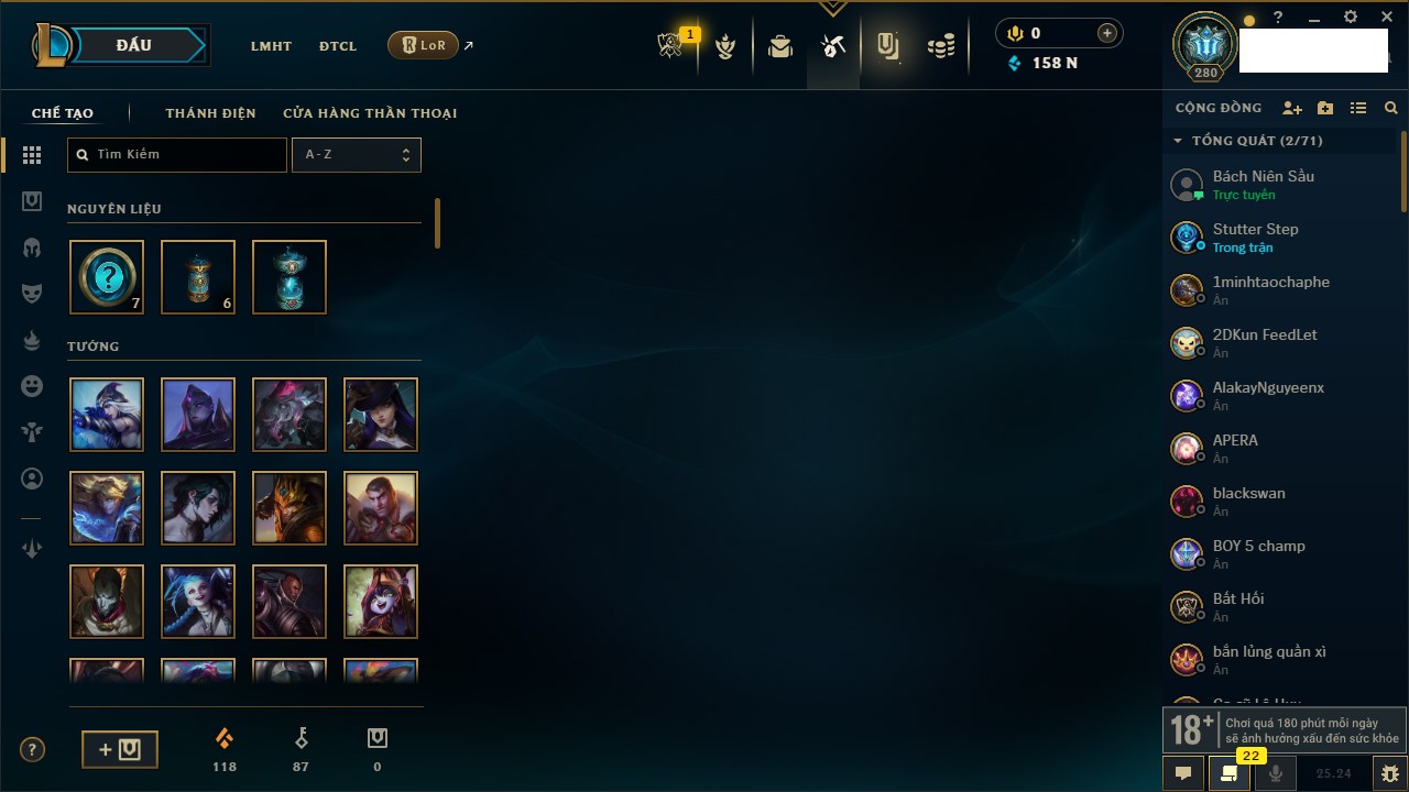 Rank Đơn: Chưa RankKhung: Chưa có khungTướng: 171 - Còn 164047 THXTrang Phục: 173Rank ĐTCL: Chưa RankLinh Thú: 77