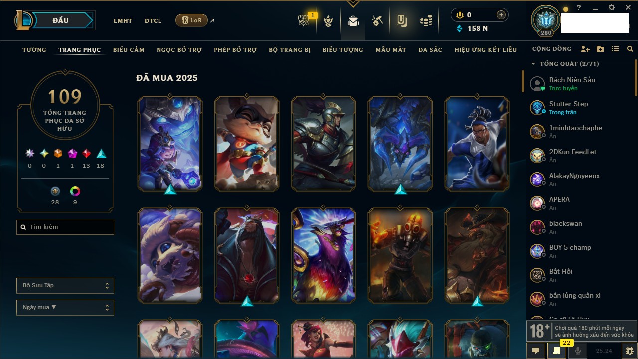 Rank Đơn: Chưa RankKhung: Chưa có khungTướng: 158 - Còn 1412 THXTrang Phục: 152Rank ĐTCL: Chưa RankLinh Thú: 69