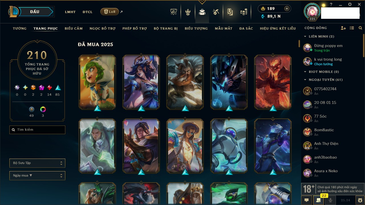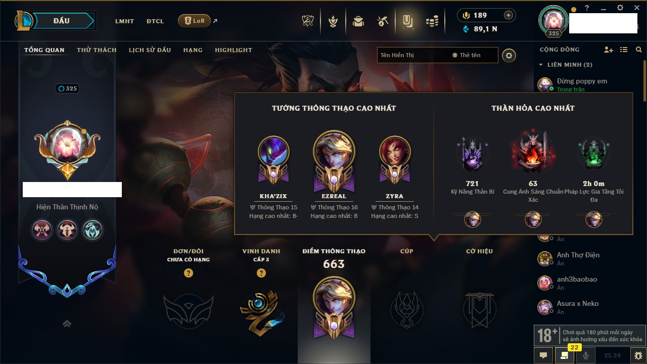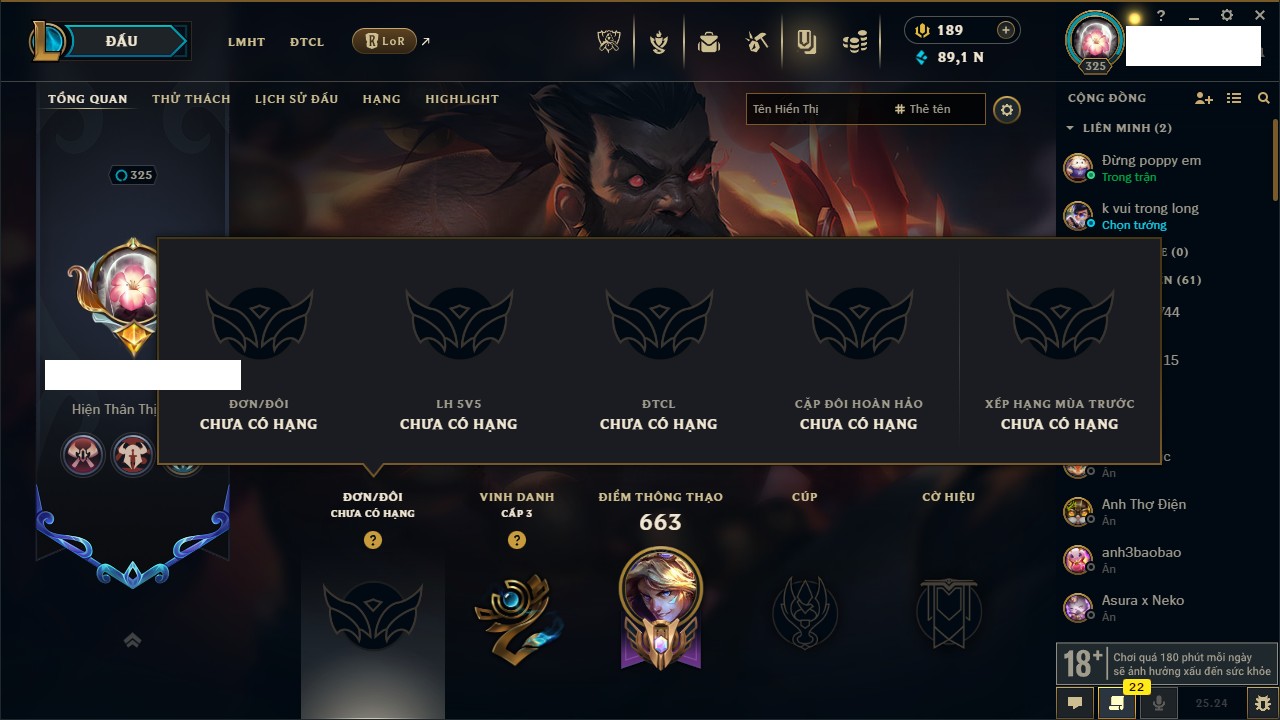 Rank Đơn: Chưa RankKhung: Bạch kimTướng: 172 - Còn 179290 THXTrang Phục: 187Rank ĐTCL: Chưa RankLinh Thú: 49