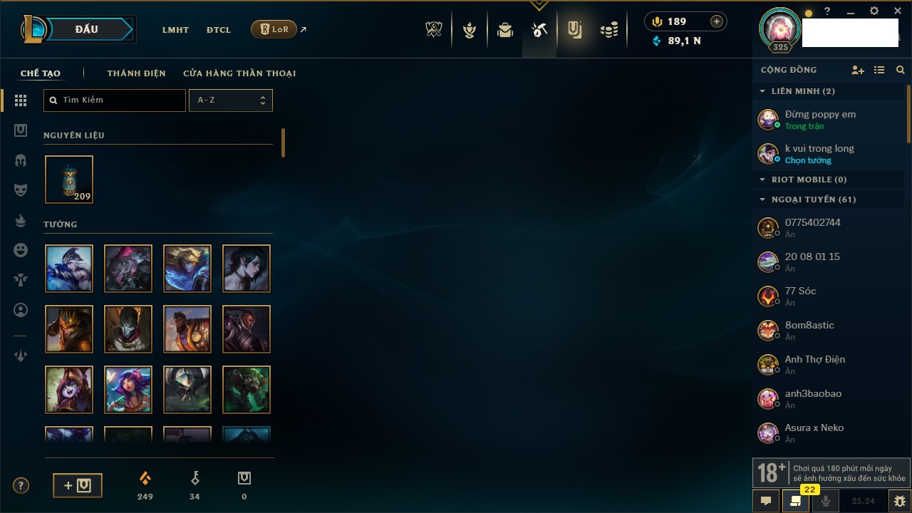 Rank Đơn: Chưa RankKhung: Chưa có khungTướng: 171 - Còn 164047 THXTrang Phục: 173Rank ĐTCL: Chưa RankLinh Thú: 77
