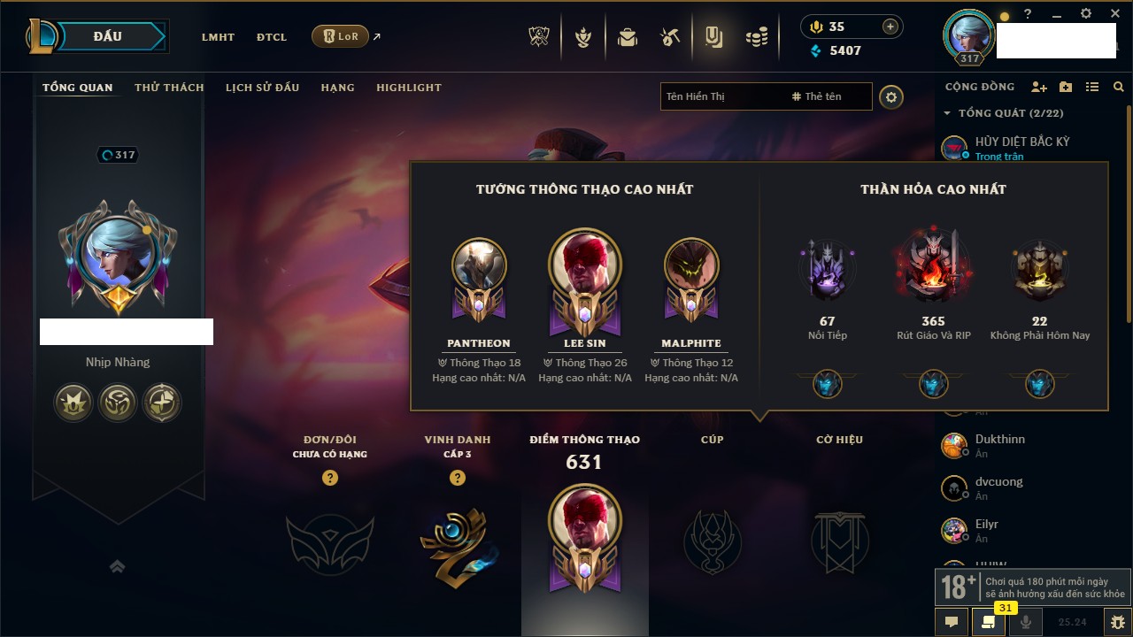 Rank Đơn: Chưa RankKhung: Chưa có khungTướng: 171 - Còn 827961 THXTrang Phục: 193Rank ĐTCL: Chưa RankLinh Thú: 63