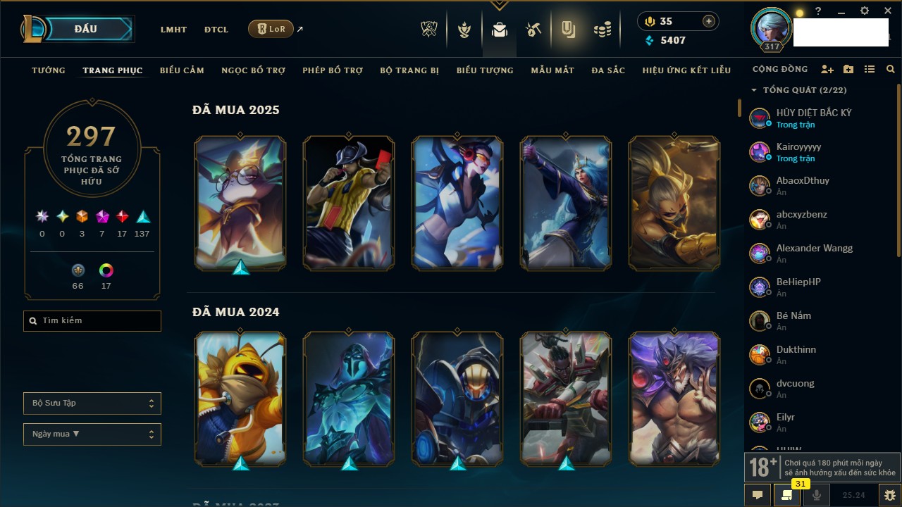 Rank Đơn: Chưa RankKhung: Chưa có khungTướng: 170 - Còn 42144 THXTrang Phục: 82Rank ĐTCL: Chưa RankLinh Thú: 130