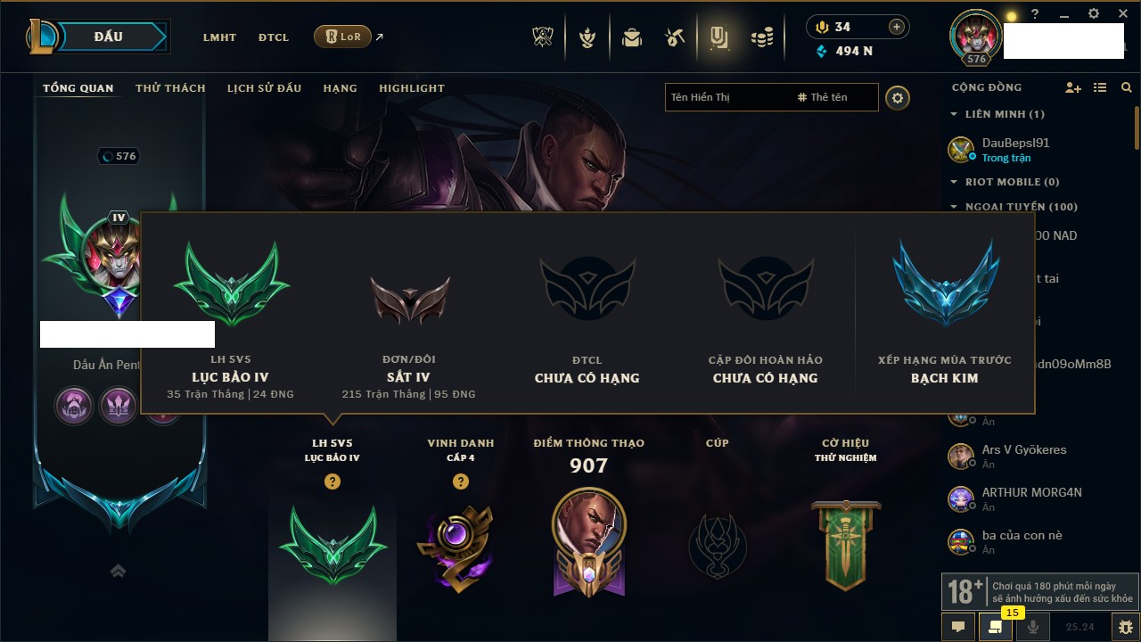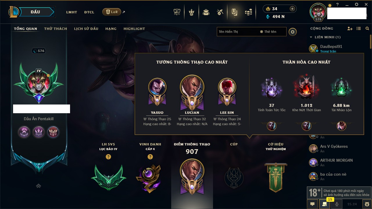 Rank Đơn: Chưa RankKhung: Chưa có khungTướng: 160 - Còn 21398 THXTrang Phục: 380Rank ĐTCL: Chưa RankLinh Thú: 27