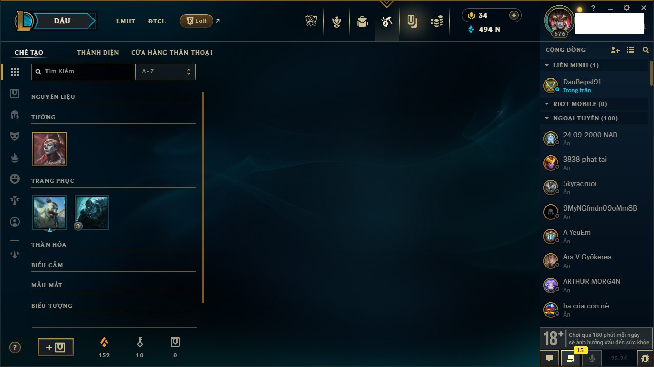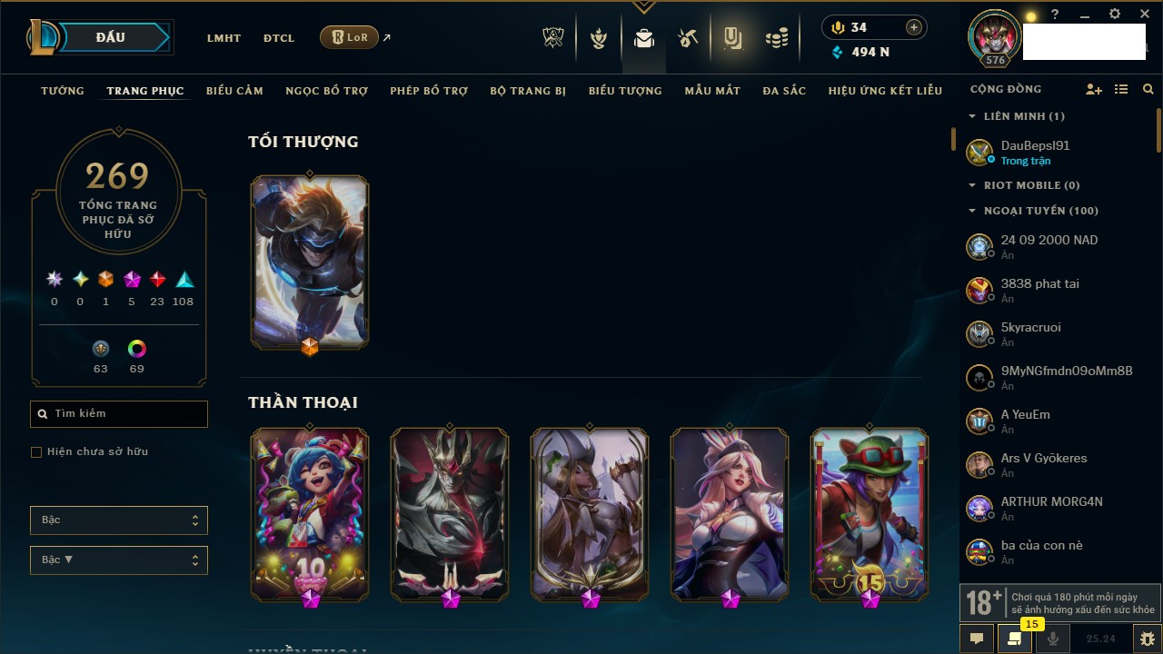Rank Đơn: Chưa RankKhung: Chưa có khungTướng: 171 - Còn 75227 THXTrang Phục: 425Rank ĐTCL: Chưa RankLinh Thú: 201