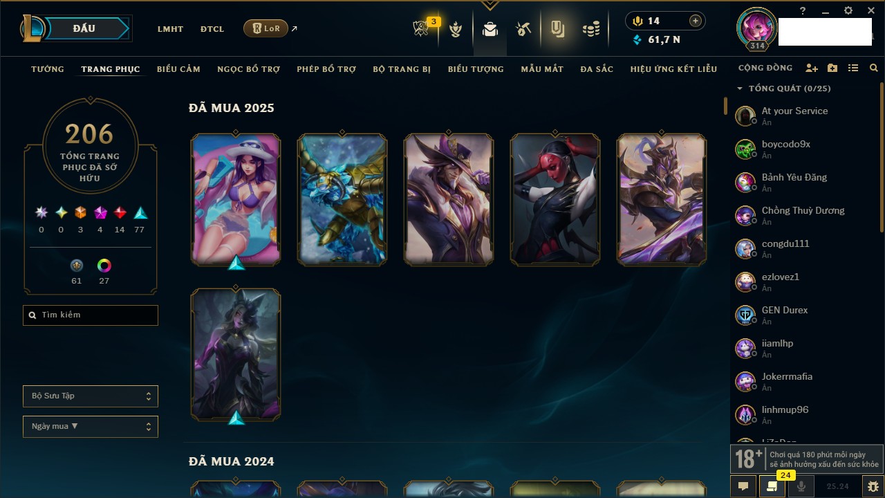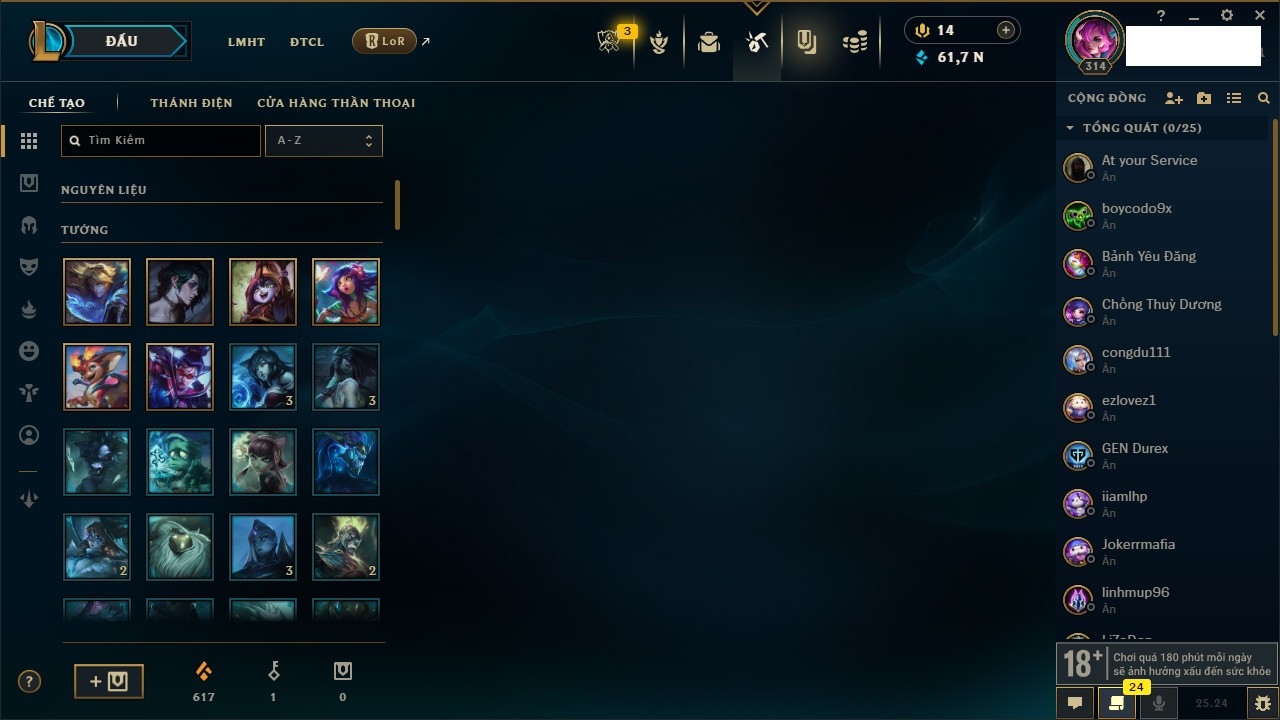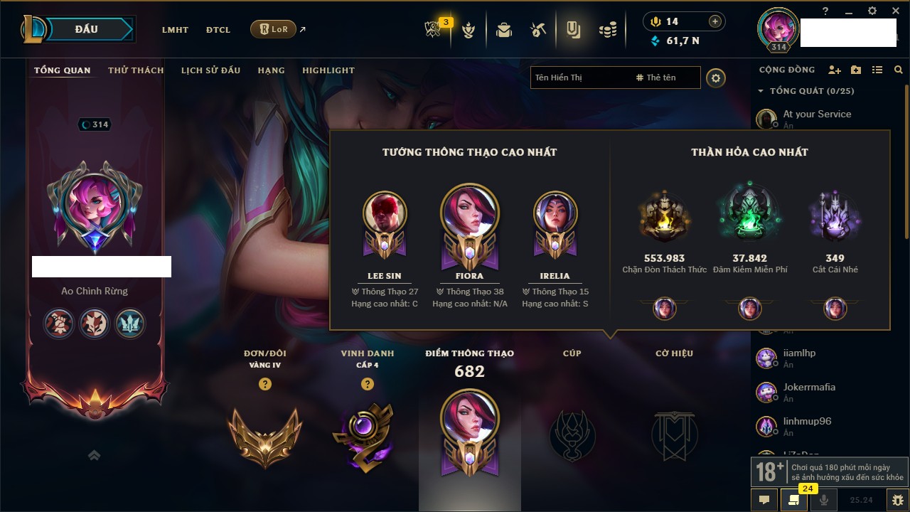 Rank Đơn: Chưa RankKhung: Chưa có khungTướng: 171 - Còn 34172 THXTrang Phục: 204Rank ĐTCL: Chưa RankLinh Thú: 21