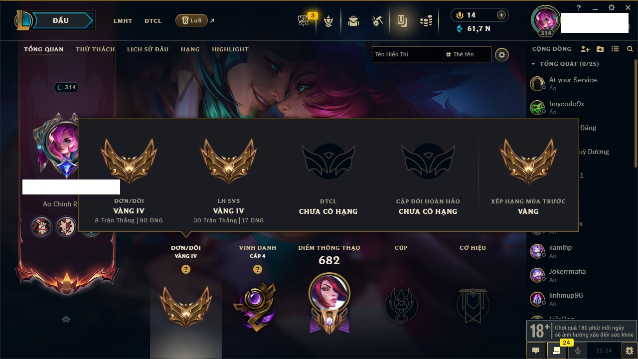 Rank Đơn: Chưa RankKhung: VàngTướng: 171 - Còn 171678 THXTrang Phục: 217Rank ĐTCL: Chưa RankLinh Thú: 124