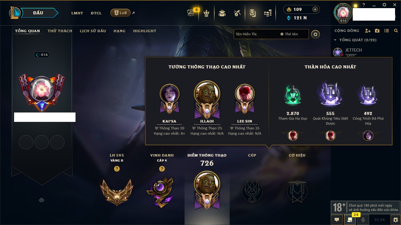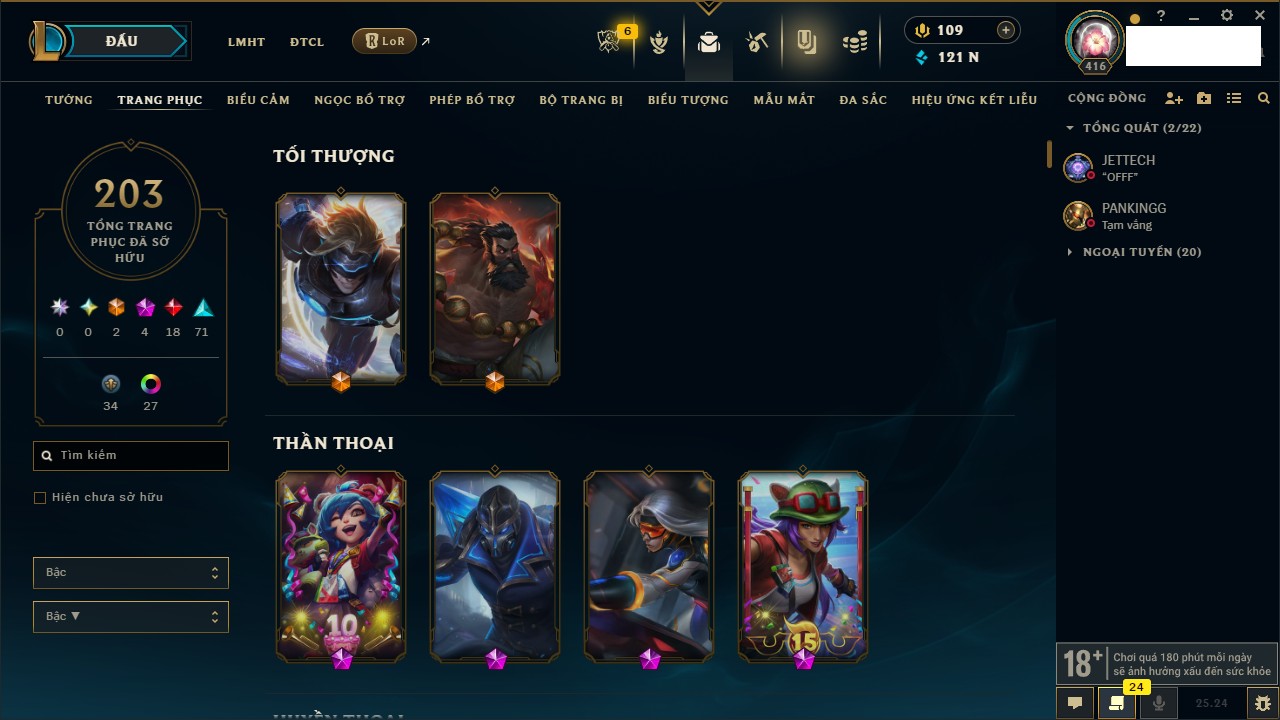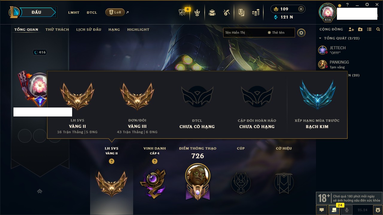 Rank Đơn: Chưa RankKhung: Chưa có khungTướng: 171 - Còn 164047 THXTrang Phục: 173Rank ĐTCL: Chưa RankLinh Thú: 77