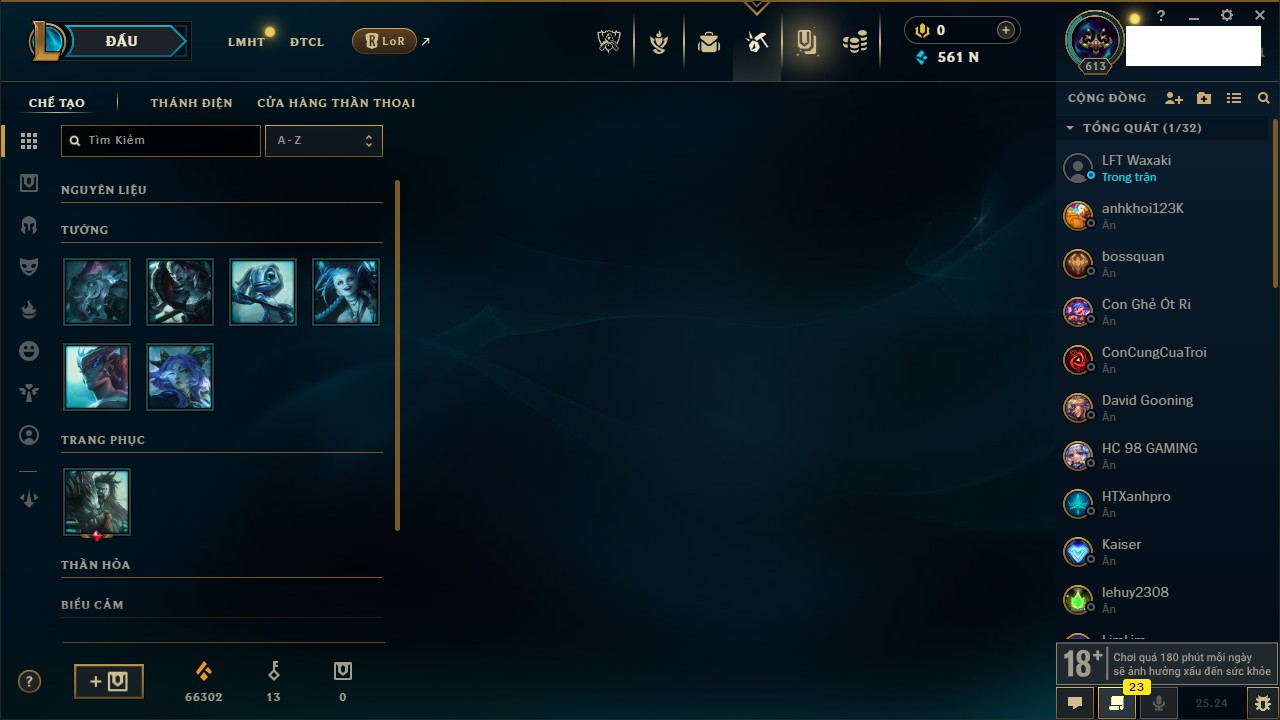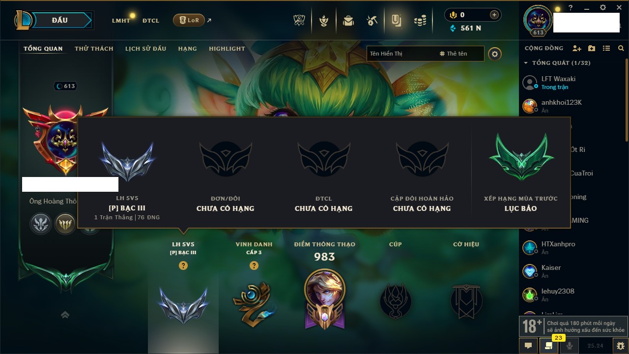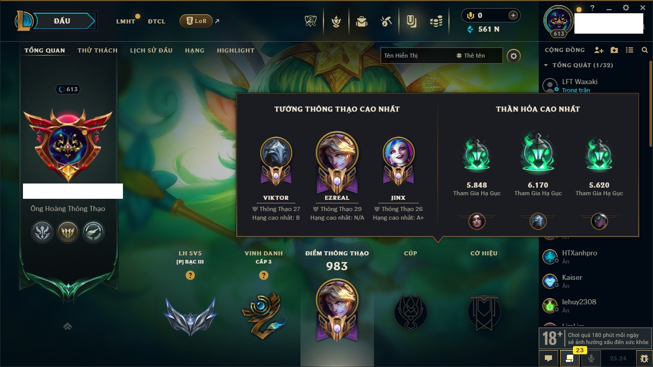 Rank Đơn: Chưa RankKhung: Bạch kimTướng: 172 - Còn 81 THXTrang Phục: 226Rank ĐTCL: Chưa RankLinh Thú: 193