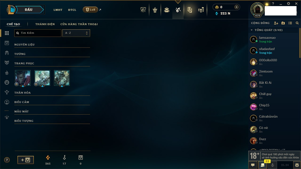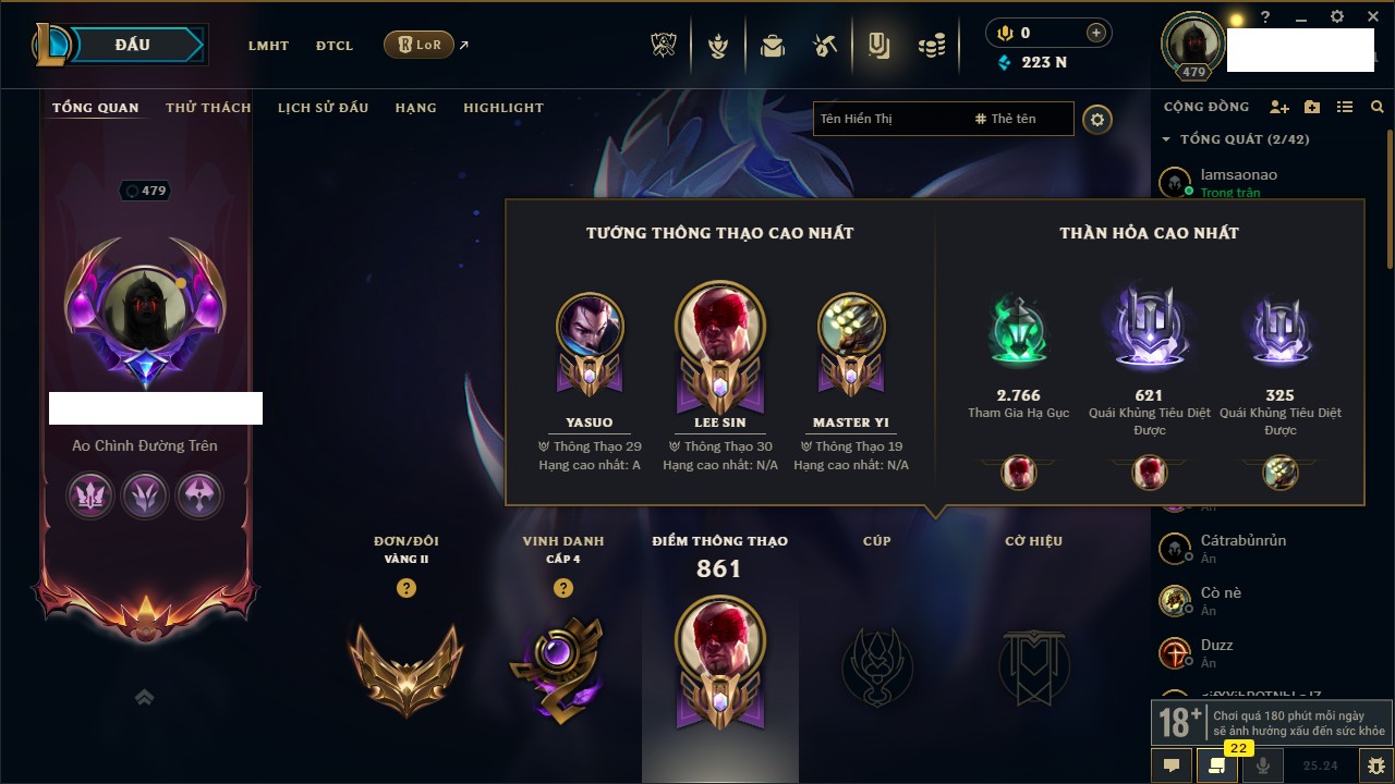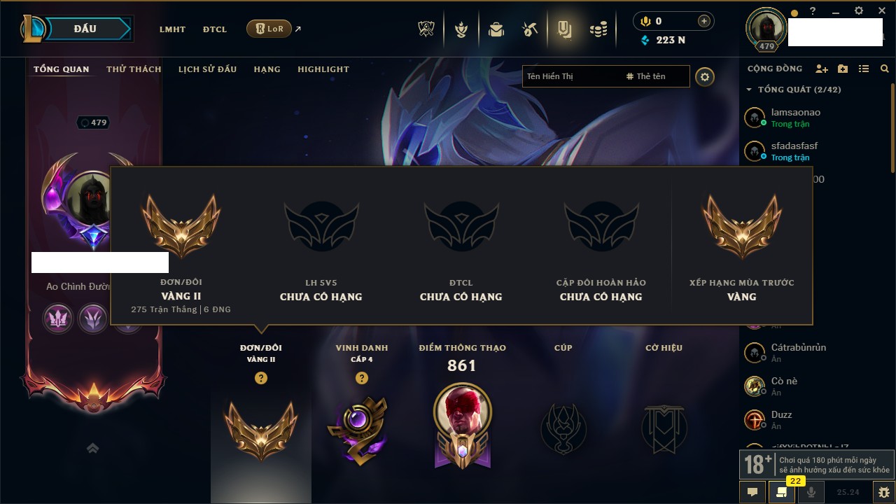 Rank Đơn: Chưa RankKhung: Chưa có khungTướng: 171 - Còn 75227 THXTrang Phục: 425Rank ĐTCL: Chưa RankLinh Thú: 201