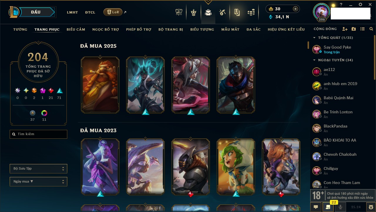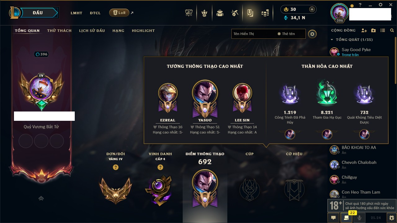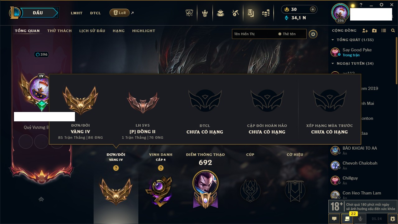 Rank Đơn: Chưa RankKhung: Chưa có khungTướng: 171 - Còn 34172 THXTrang Phục: 204Rank ĐTCL: Chưa RankLinh Thú: 21