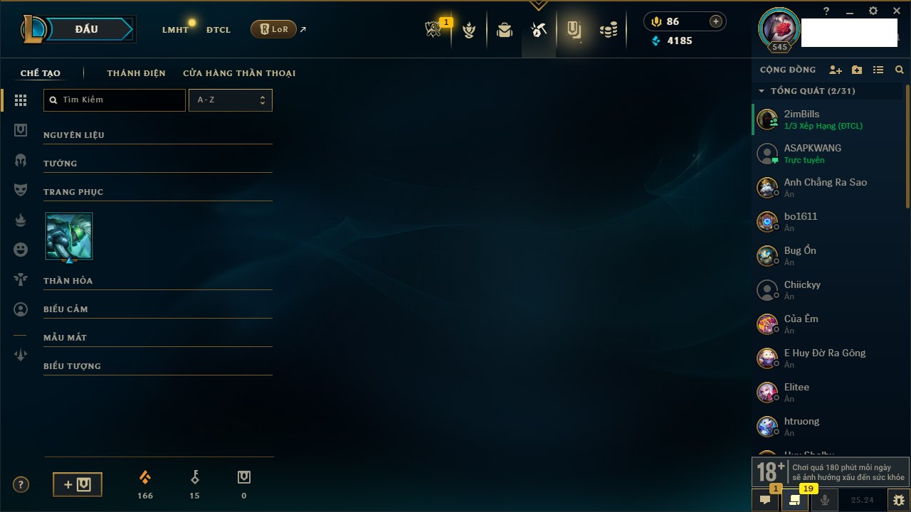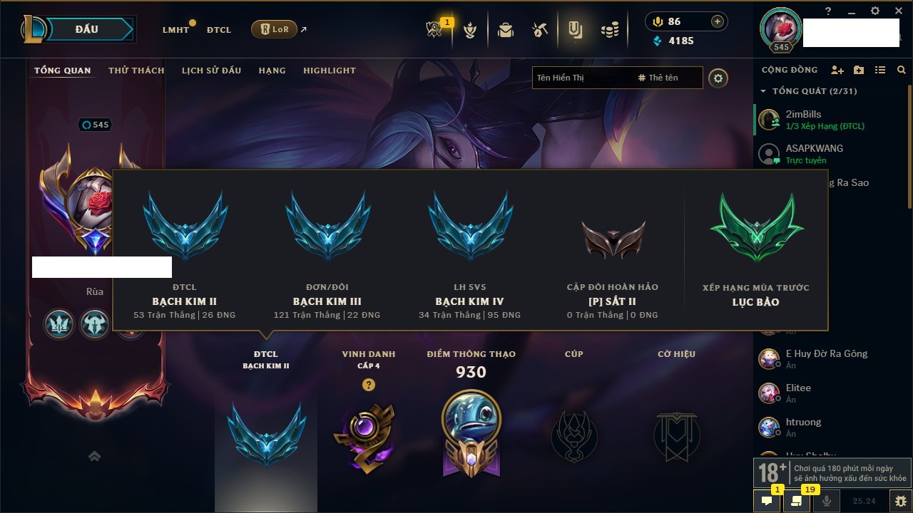 Rank Đơn: Chưa RankKhung: Chưa có khungTướng: 171 - Còn 75227 THXTrang Phục: 425Rank ĐTCL: Chưa RankLinh Thú: 201