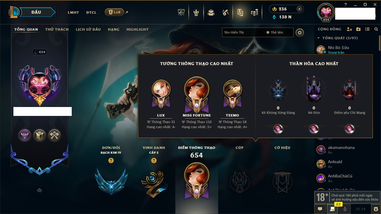 Rank Đơn: Chưa RankKhung: VàngTướng: 171 - Còn 660284 THXTrang Phục: 199Rank ĐTCL: Chưa RankLinh Thú: 34