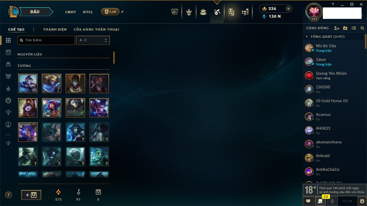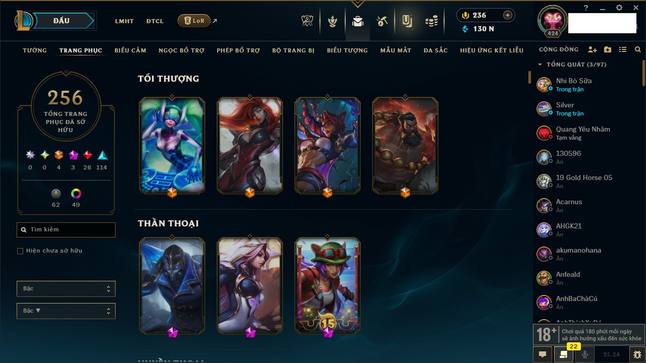 Rank Đơn: Chưa RankKhung: Chưa có khungTướng: 171 - Còn 827961 THXTrang Phục: 193Rank ĐTCL: Chưa RankLinh Thú: 63