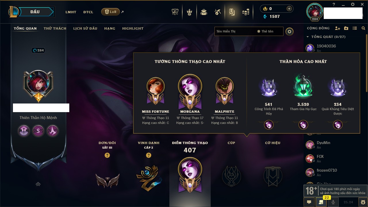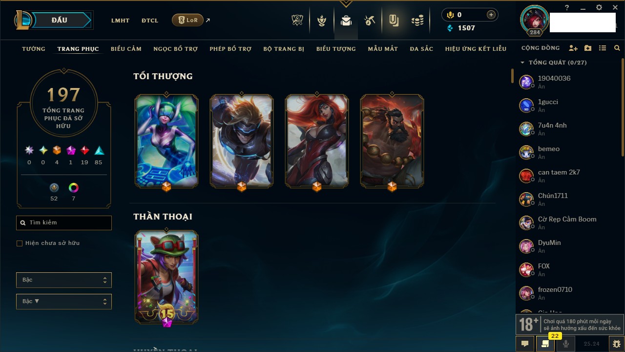 Rank Đơn: Chưa RankKhung: Bạch kimTướng: 172 - Còn 867 THXTrang Phục: 242Rank ĐTCL: Chưa RankLinh Thú: 162