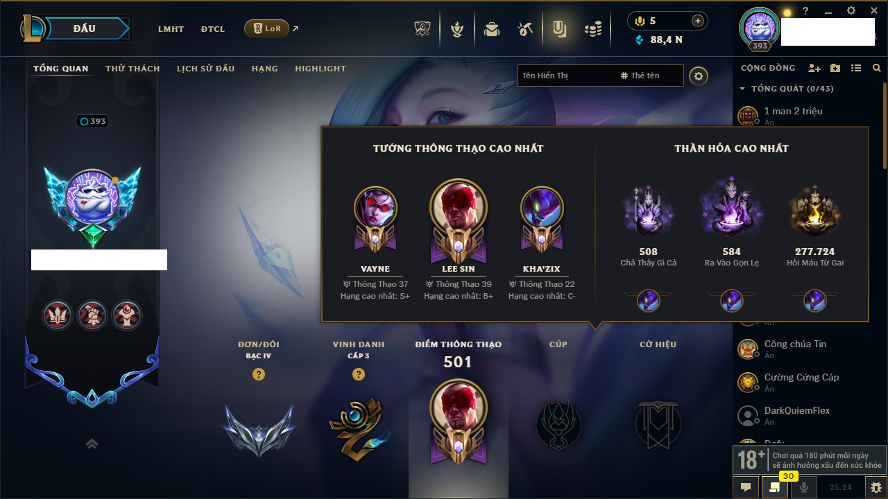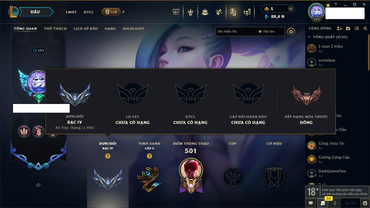 Rank Đơn: Chưa RankKhung: Chưa có khungTướng: 171 - Còn 164047 THXTrang Phục: 173Rank ĐTCL: Chưa RankLinh Thú: 77