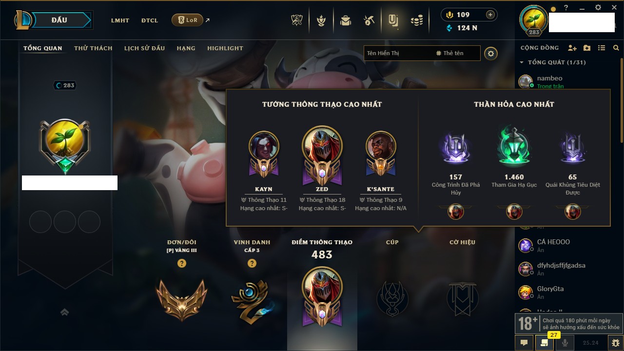 Rank Đơn: Chưa RankKhung: Bạch kimTướng: 172 - Còn 81 THXTrang Phục: 226Rank ĐTCL: Chưa RankLinh Thú: 193