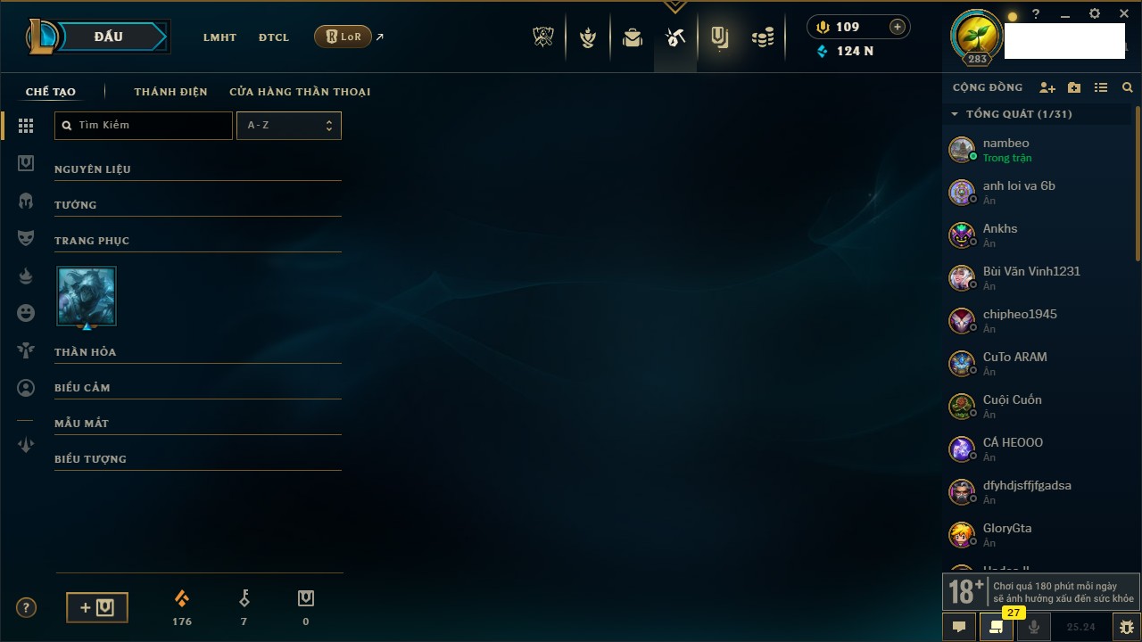 Rank Đơn: Chưa RankKhung: Chưa có khungTướng: 172 - Còn 124206 THXTrang Phục: 232Rank ĐTCL: Chưa RankLinh Thú: 112