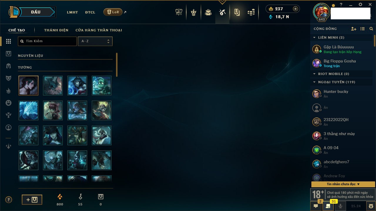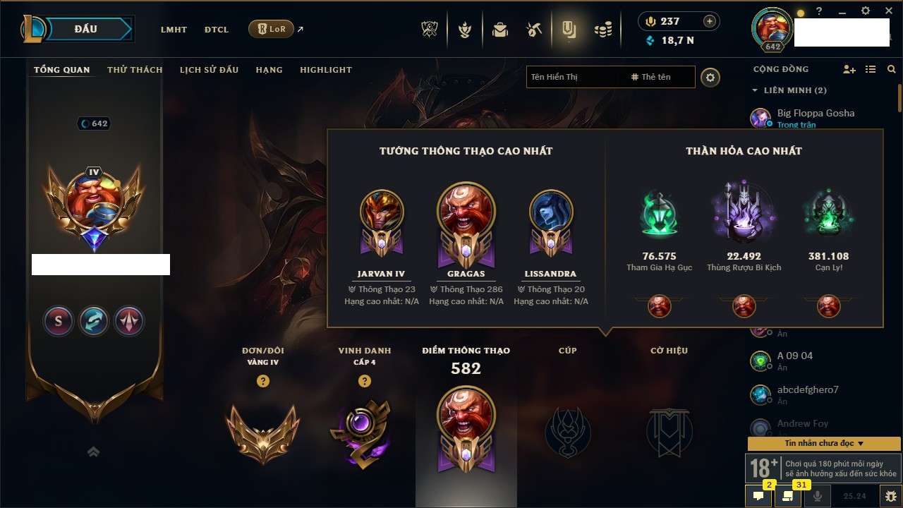 Rank Đơn: Chưa Rank Khung: Bạch kim Tướng: 170 - Còn 31547 THX Trang Phục: 197 Rank ĐTCL: Chưa Rank Linh Thú: 113