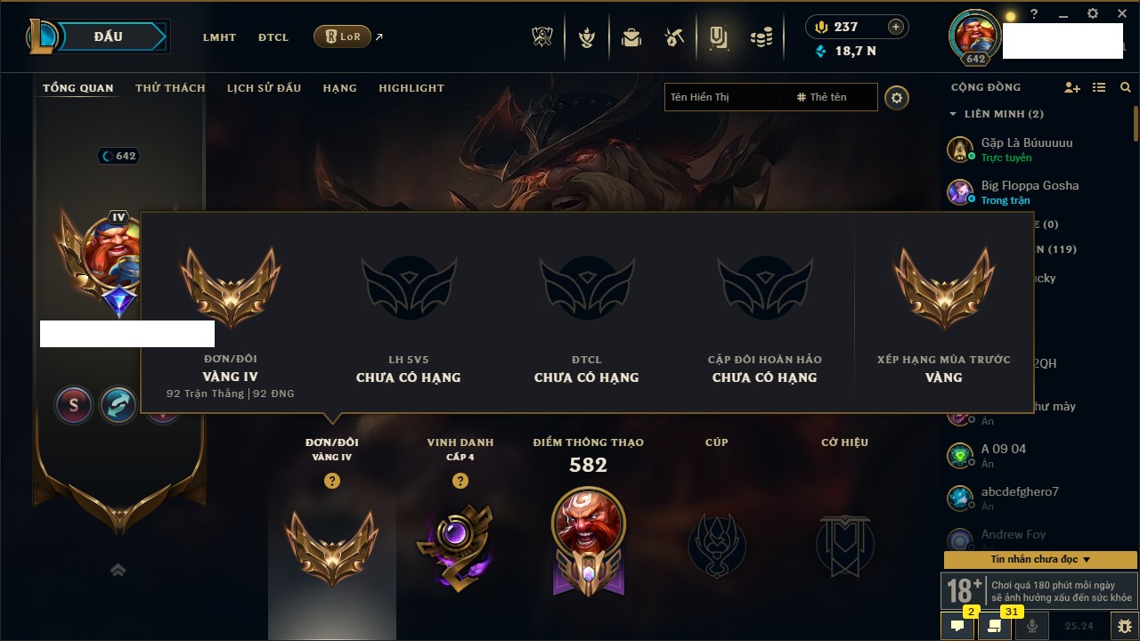 Rank Đơn: Chưa Rank Khung: Bạch kim Tướng: 145 - Còn 9448 THX Trang Phục: 62 Rank ĐTCL: Chưa Rank Linh Thú: 130