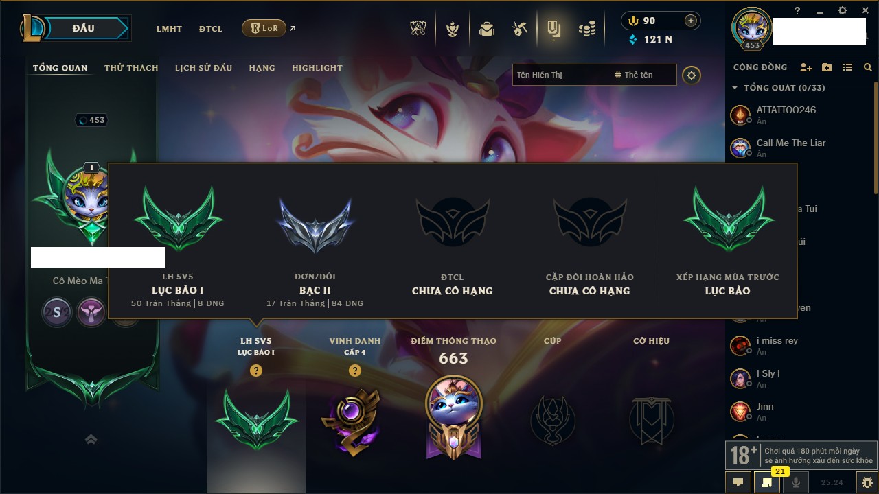 Rank Đơn: Chưa RankKhung: Bạch kimTướng: 172 - Còn 81 THXTrang Phục: 226Rank ĐTCL: Chưa RankLinh Thú: 193
