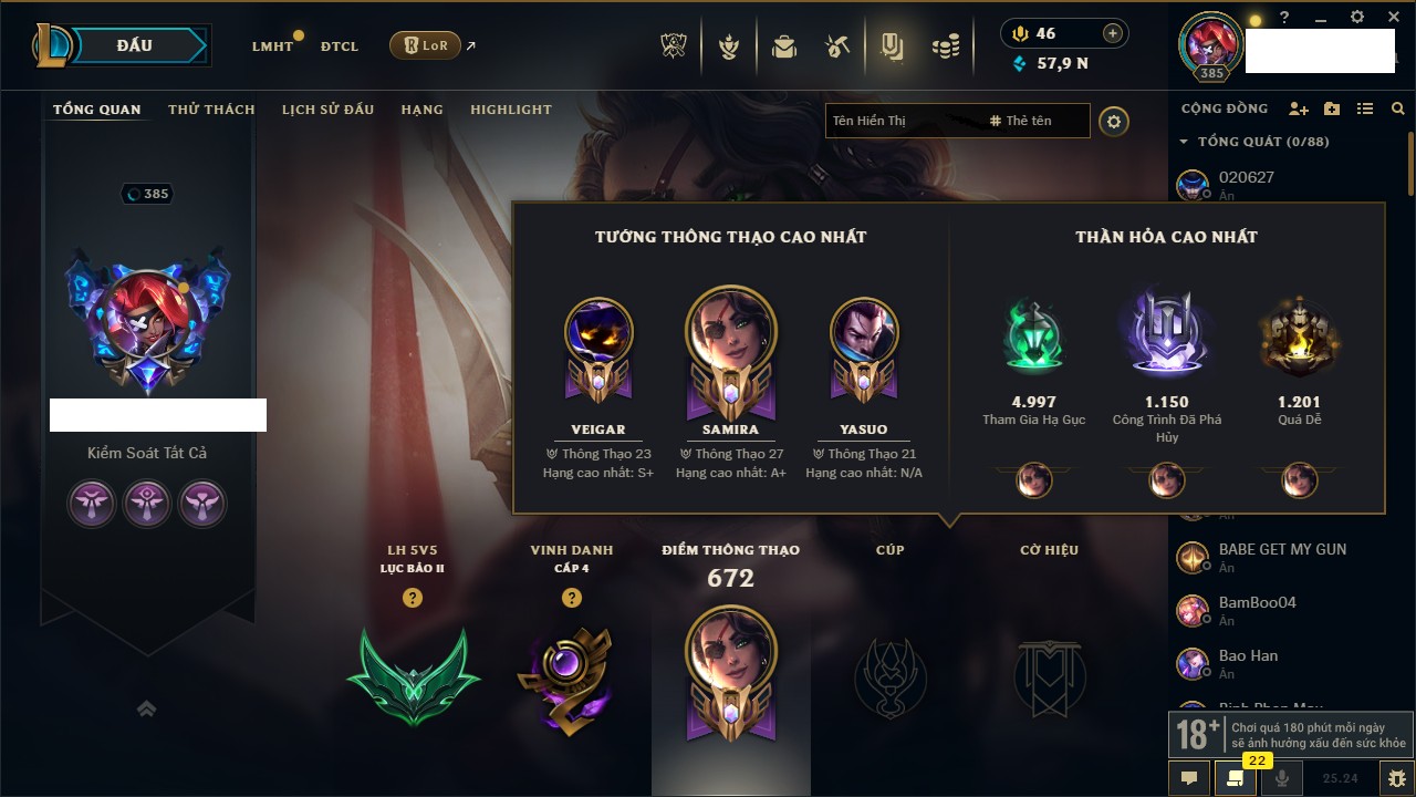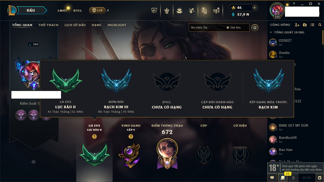 Rank Đơn: Chưa RankKhung: Bạch kimTướng: 172 - Còn 59200 THXTrang Phục: 471Rank ĐTCL: Bạch Kim IIILinh Thú: 114