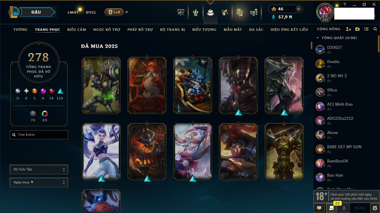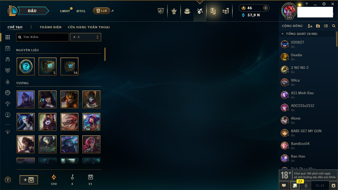 Rank Đơn: Chưa RankKhung: Chưa có khungTướng: 169 - Còn 43188 THXTrang Phục: 205Rank ĐTCL: Chưa RankLinh Thú: 259