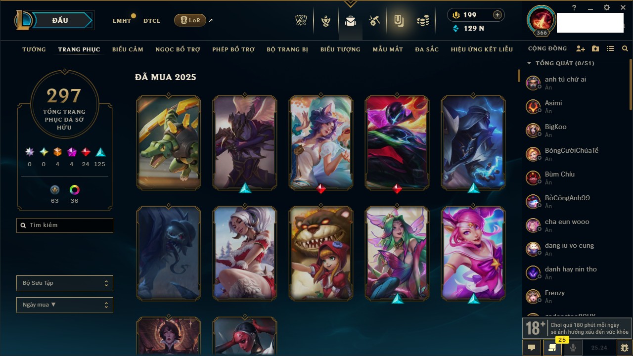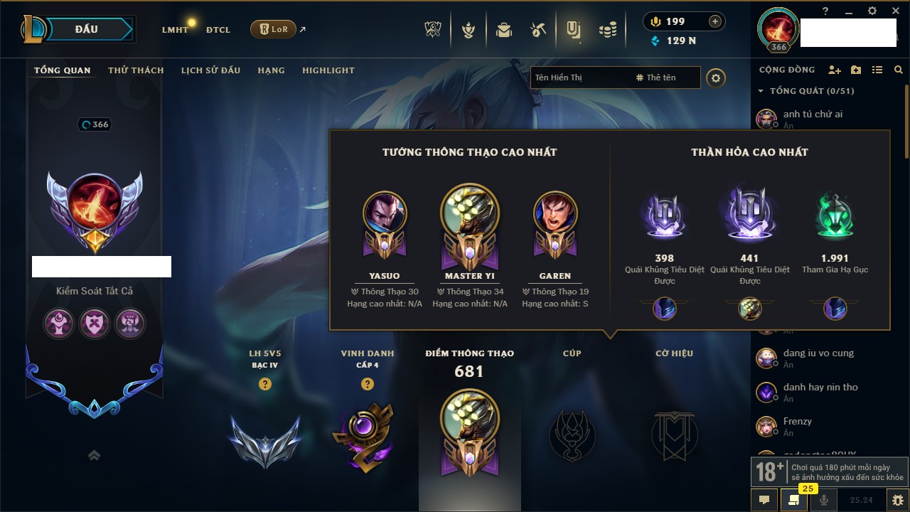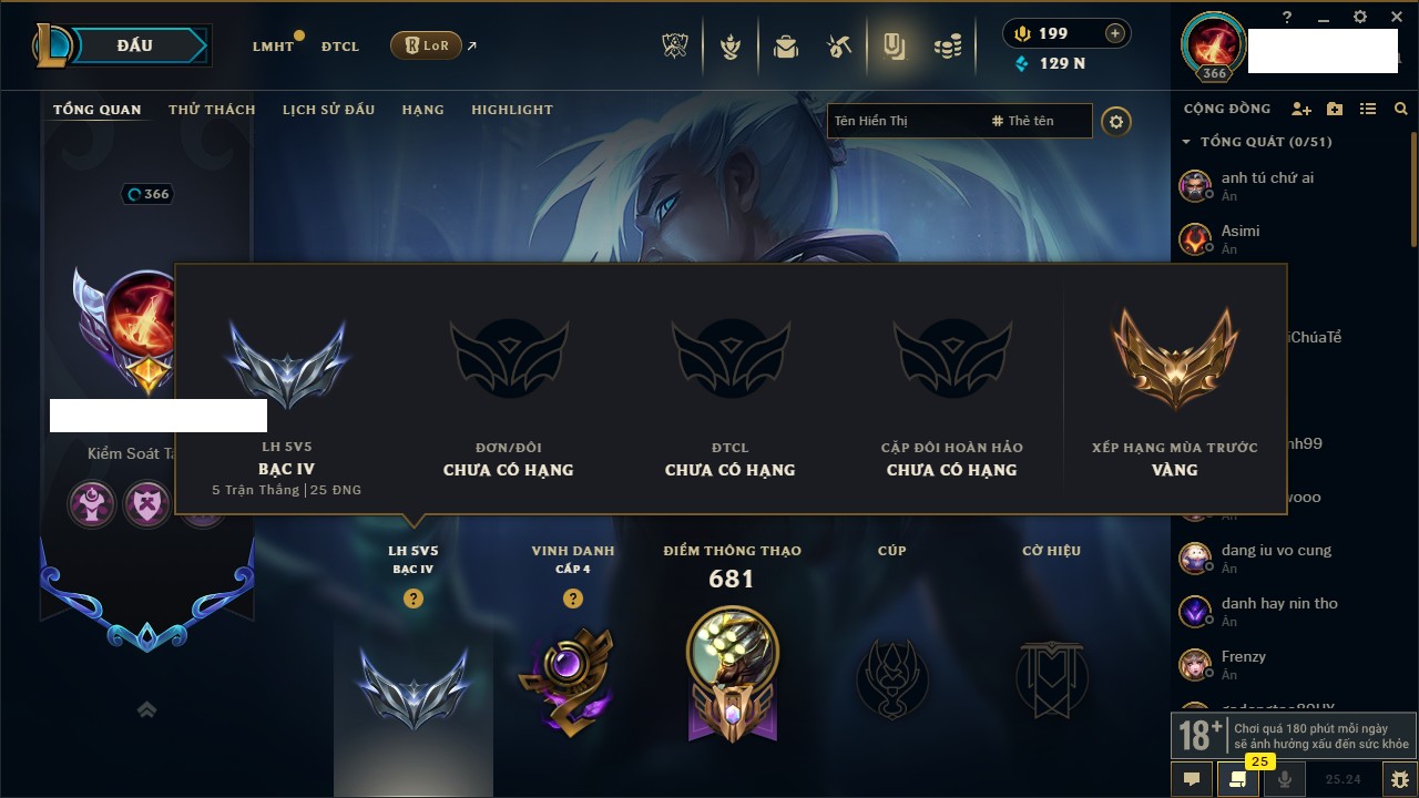 Rank Đơn: Chưa RankKhung: VàngTướng: 171 - Còn 660284 THXTrang Phục: 199Rank ĐTCL: Chưa RankLinh Thú: 34