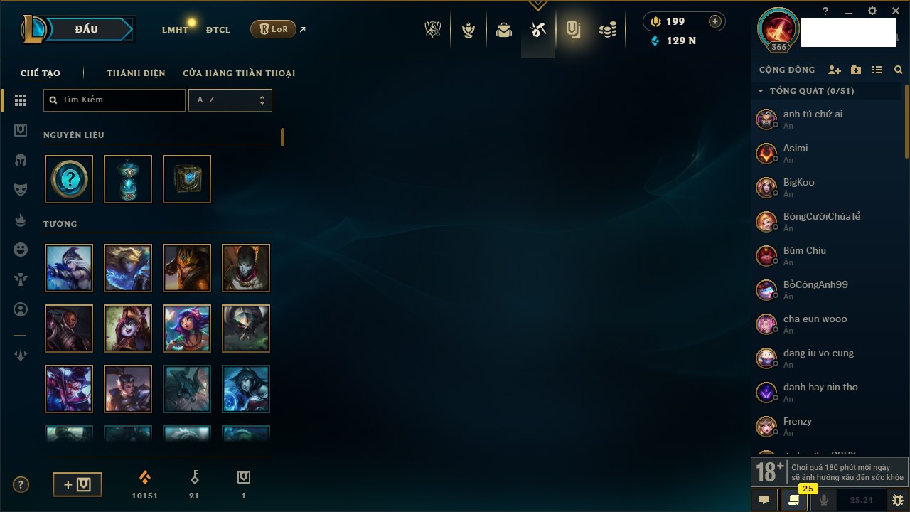 Rank Đơn: Chưa RankKhung: Chưa có khungTướng: 171 - Còn 827961 THXTrang Phục: 193Rank ĐTCL: Chưa RankLinh Thú: 63
