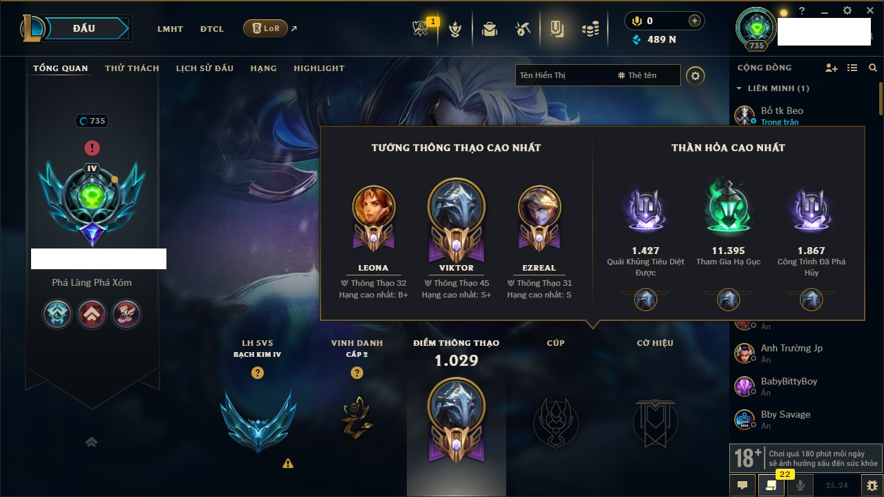 Rank Đơn: Chưa RankKhung: Bạch kimTướng: 172 - Còn 81 THXTrang Phục: 226Rank ĐTCL: Chưa RankLinh Thú: 193