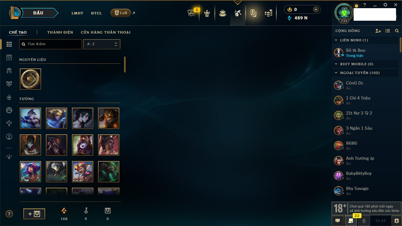 Rank Đơn: Chưa RankKhung: Chưa có khungTướng: 172 - Còn 124206 THXTrang Phục: 232Rank ĐTCL: Chưa RankLinh Thú: 112