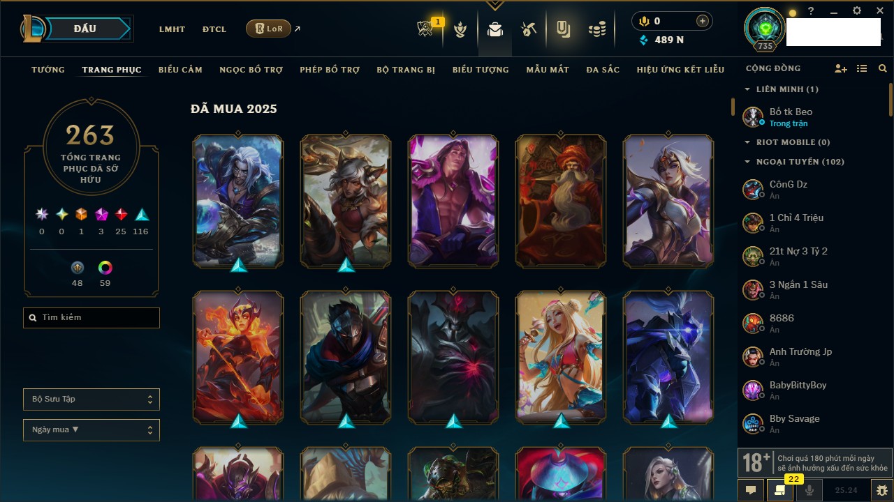 Rank Đơn: Chưa RankKhung: VàngTướng: 171 - Còn 489498 THXTrang Phục: 263Rank ĐTCL: Chưa RankLinh Thú: 39