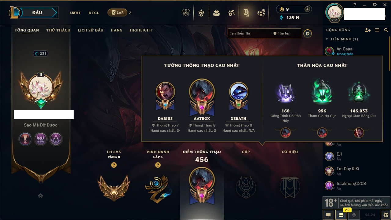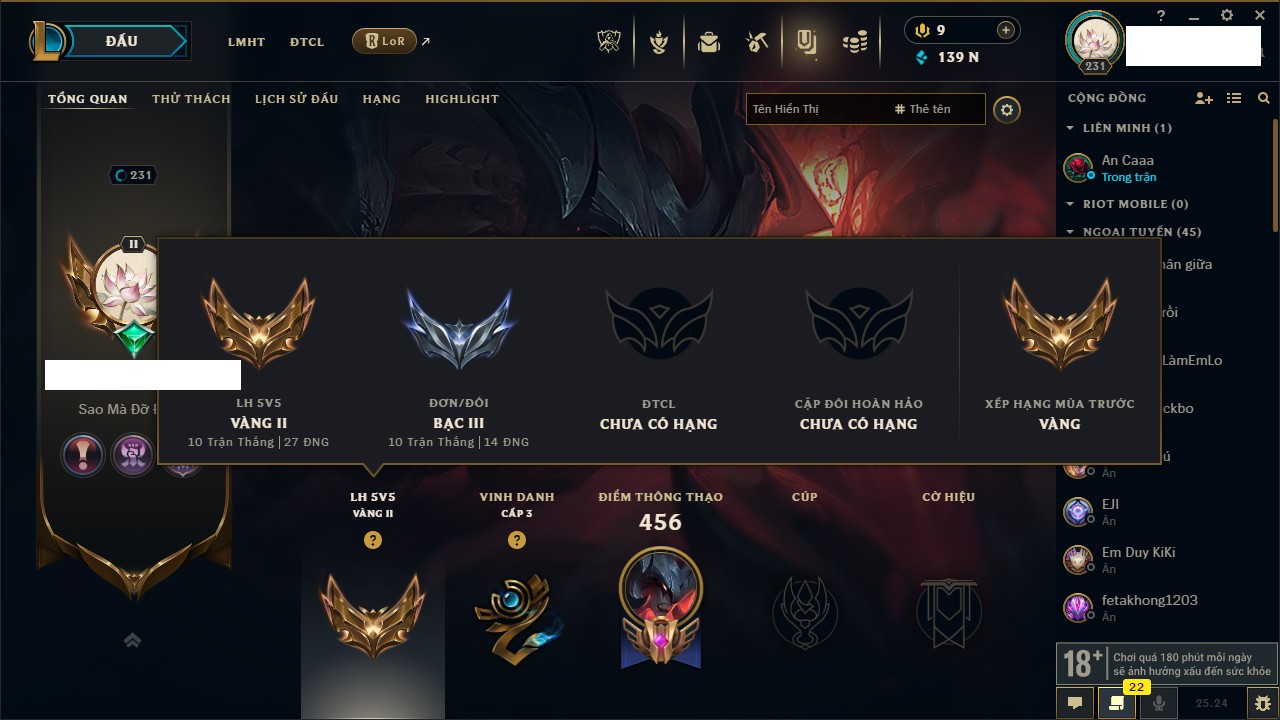 Rank Đơn: Chưa RankKhung: Bạch kimTướng: 172 - Còn 81 THXTrang Phục: 226Rank ĐTCL: Chưa RankLinh Thú: 193