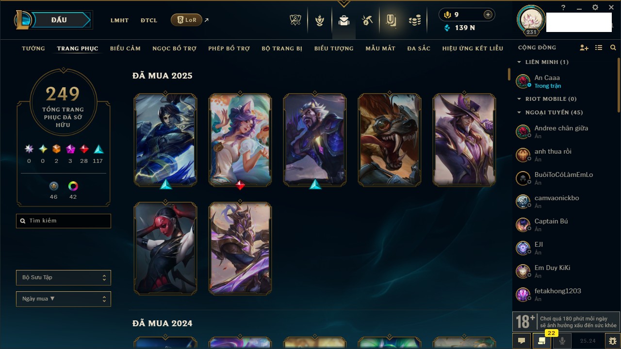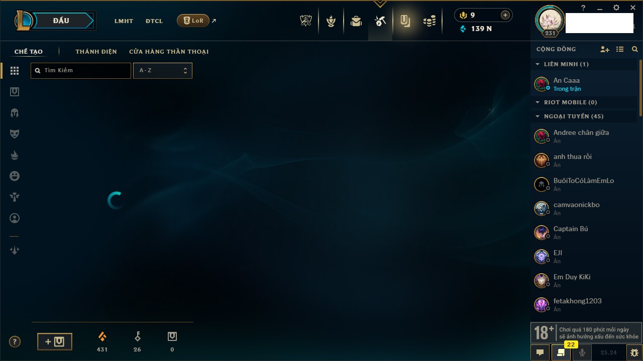 Rank Đơn: Chưa RankKhung: VàngTướng: 171 - Còn 489498 THXTrang Phục: 263Rank ĐTCL: Chưa RankLinh Thú: 39