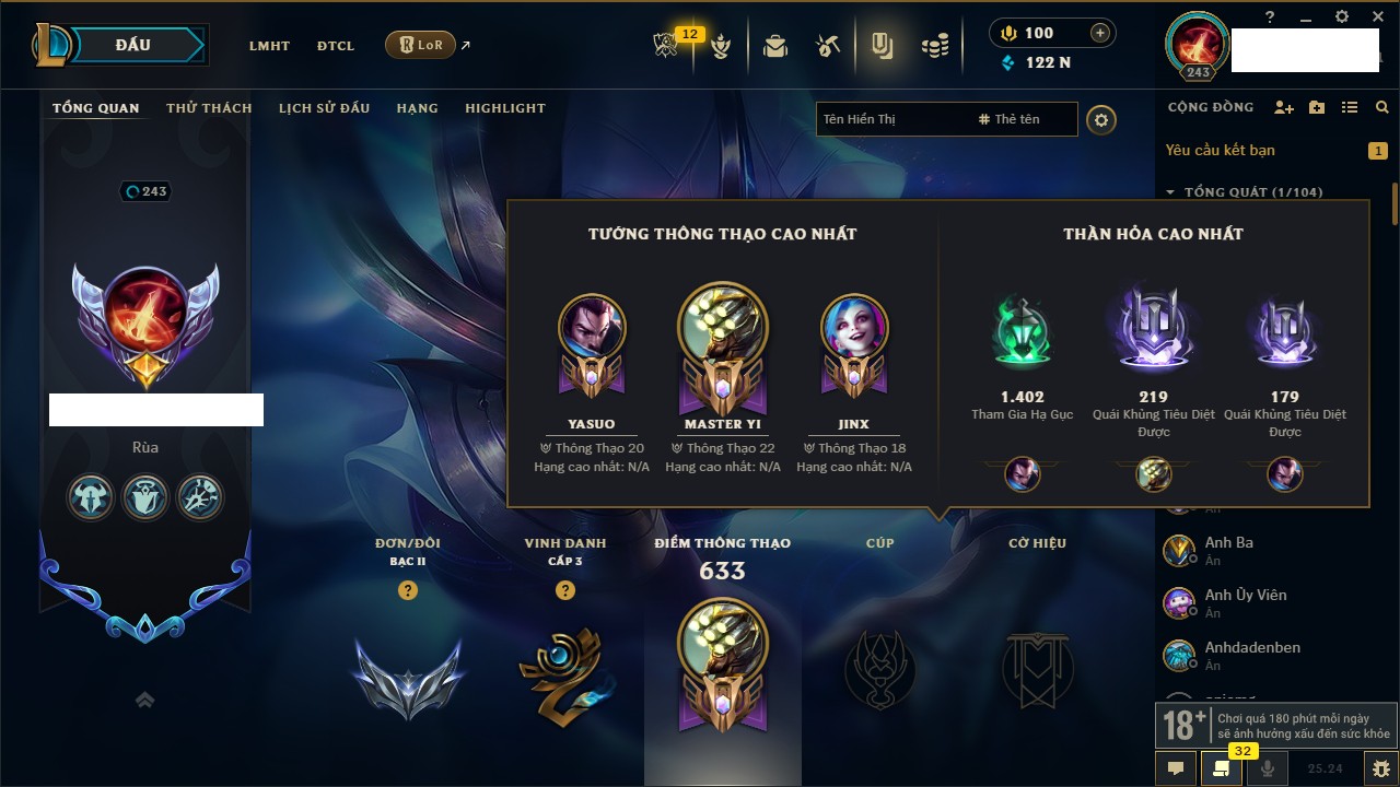Rank Đơn: Chưa RankKhung: Chưa có khungTướng: 171 - Còn 827961 THXTrang Phục: 193Rank ĐTCL: Chưa RankLinh Thú: 63