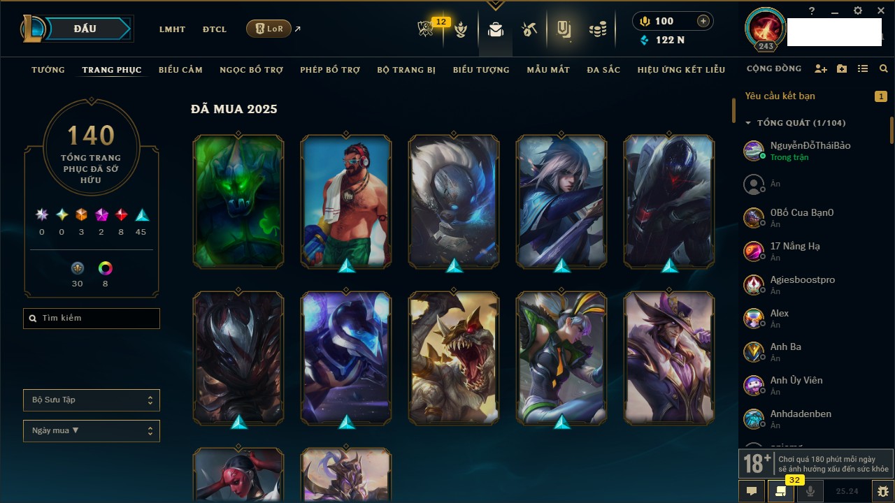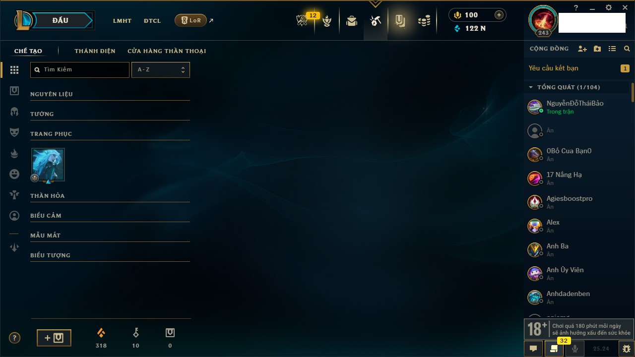 Rank Đơn: Chưa RankKhung: SắtTướng: 161 - Còn 107294 THXTrang Phục: 86Rank ĐTCL: Chưa RankLinh Thú: 204
