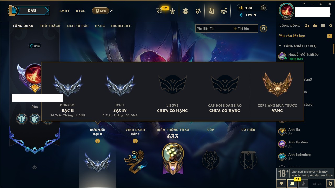 Rank Đơn: Chưa RankKhung: VàngTướng: 171 - Còn 660284 THXTrang Phục: 199Rank ĐTCL: Chưa RankLinh Thú: 34