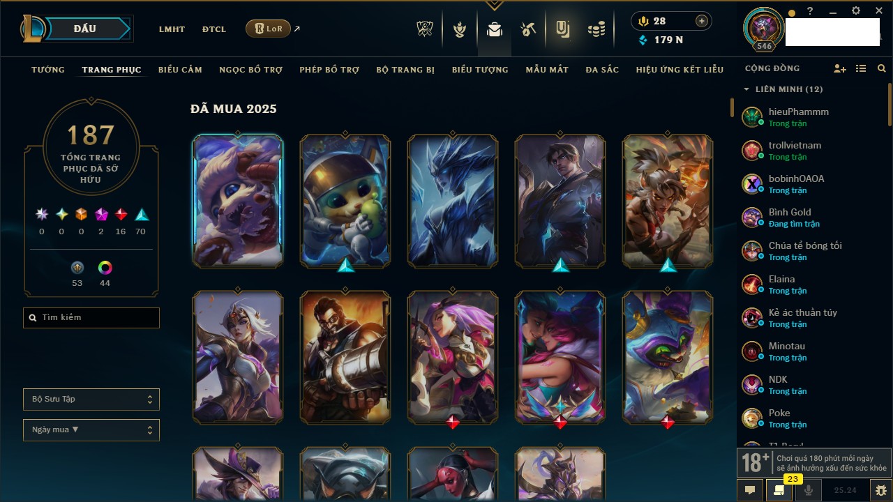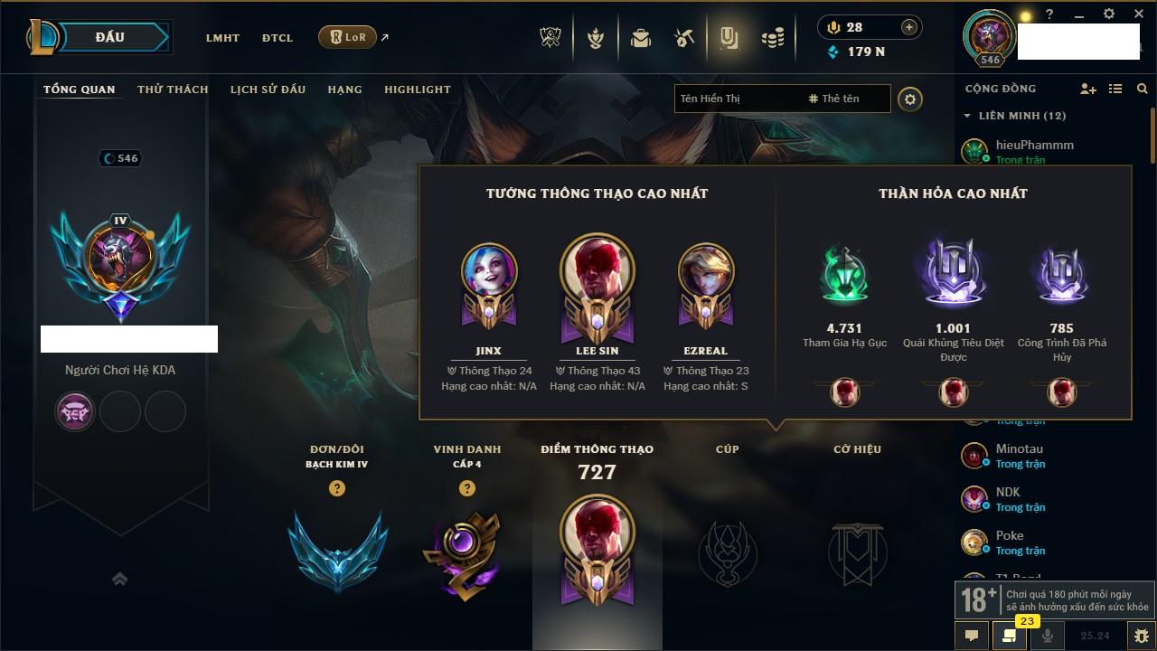 Rank Đơn: Chưa RankKhung: Chưa có khungTướng: 171 - Còn 164047 THXTrang Phục: 173Rank ĐTCL: Chưa RankLinh Thú: 77