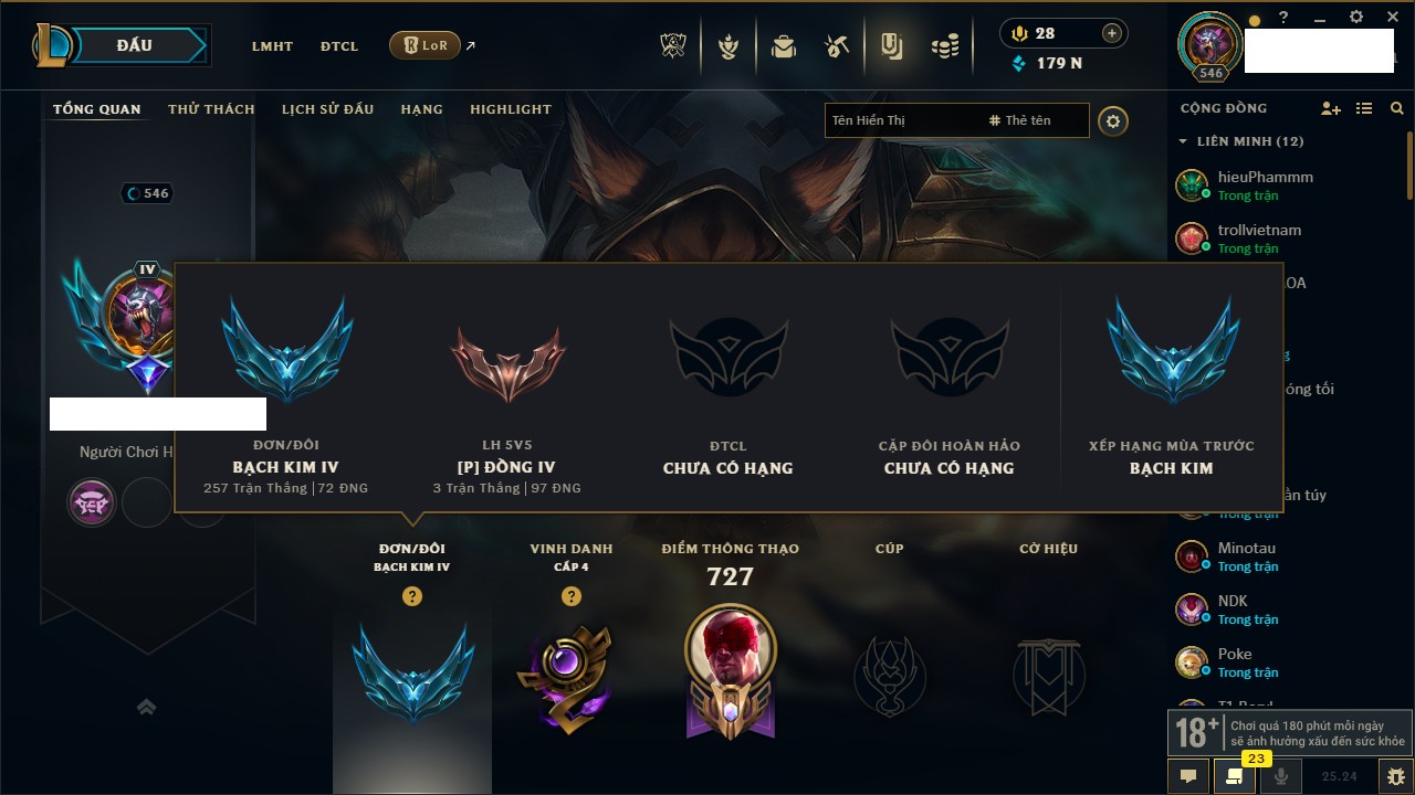 Rank Đơn: Chưa RankKhung: ĐồngTướng: 172 - Còn 98459 THXTrang Phục: 177Rank ĐTCL: Chưa RankLinh Thú: 42